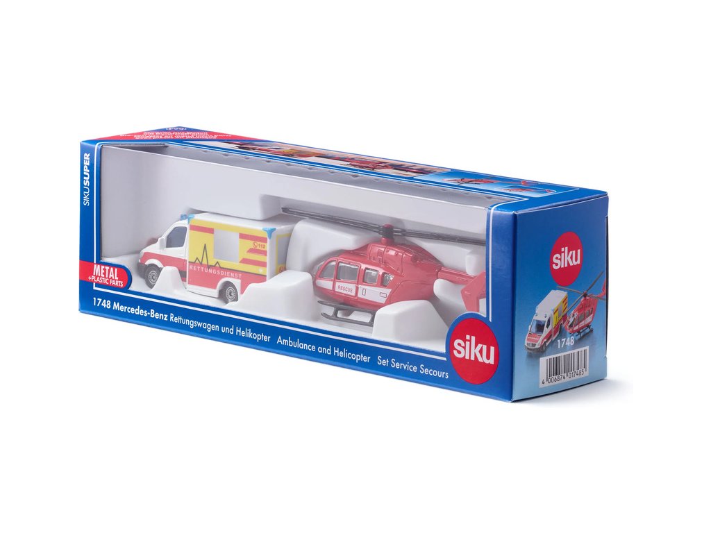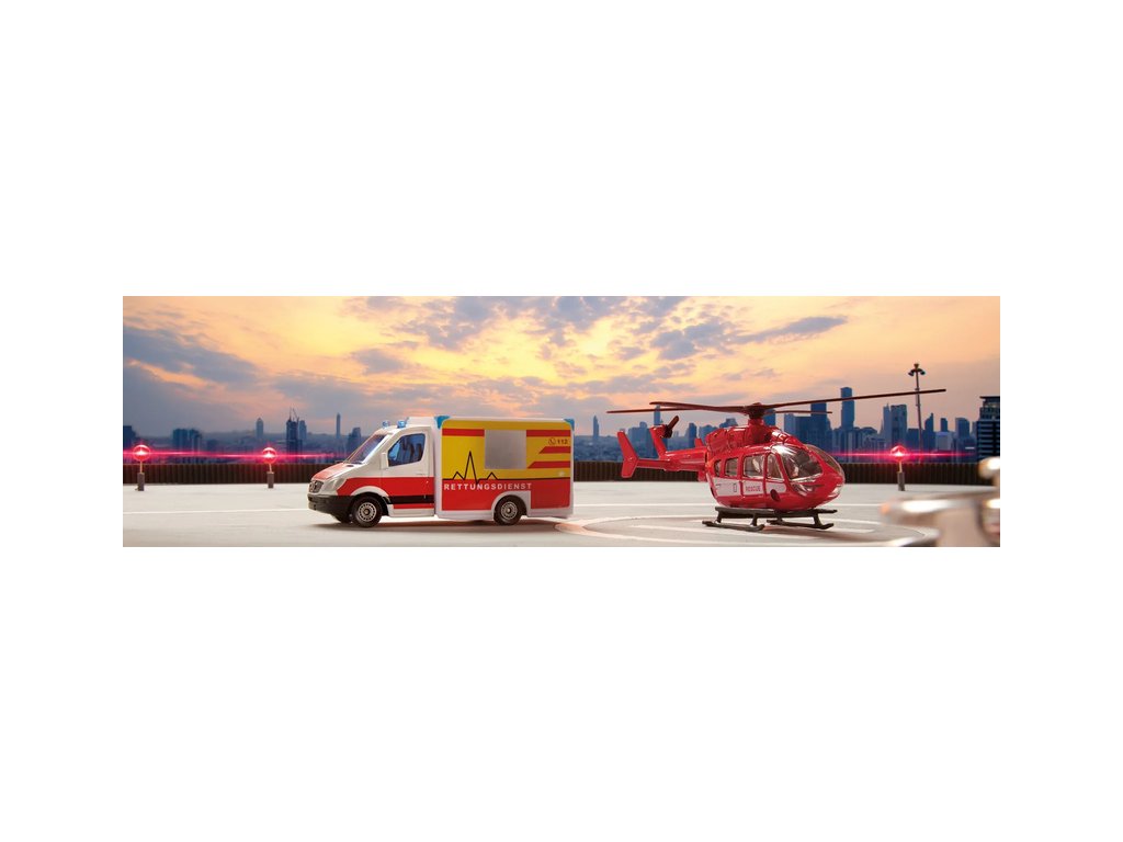 Kovový model ambulance Mercedes-Benz s vrtulníkem Eurocopter EC 145 v měřítku 1:87 od značky Siku. Vrtulník má otočné vrtule hlavního i ocasního rotoru. Model sanitky repliku všechny detaily, včetně majáčků a obsahuje gumové pneumatiky. Vhodné pro hraní i sběratelství. Kvalitní zpracování z kovu a plastu.