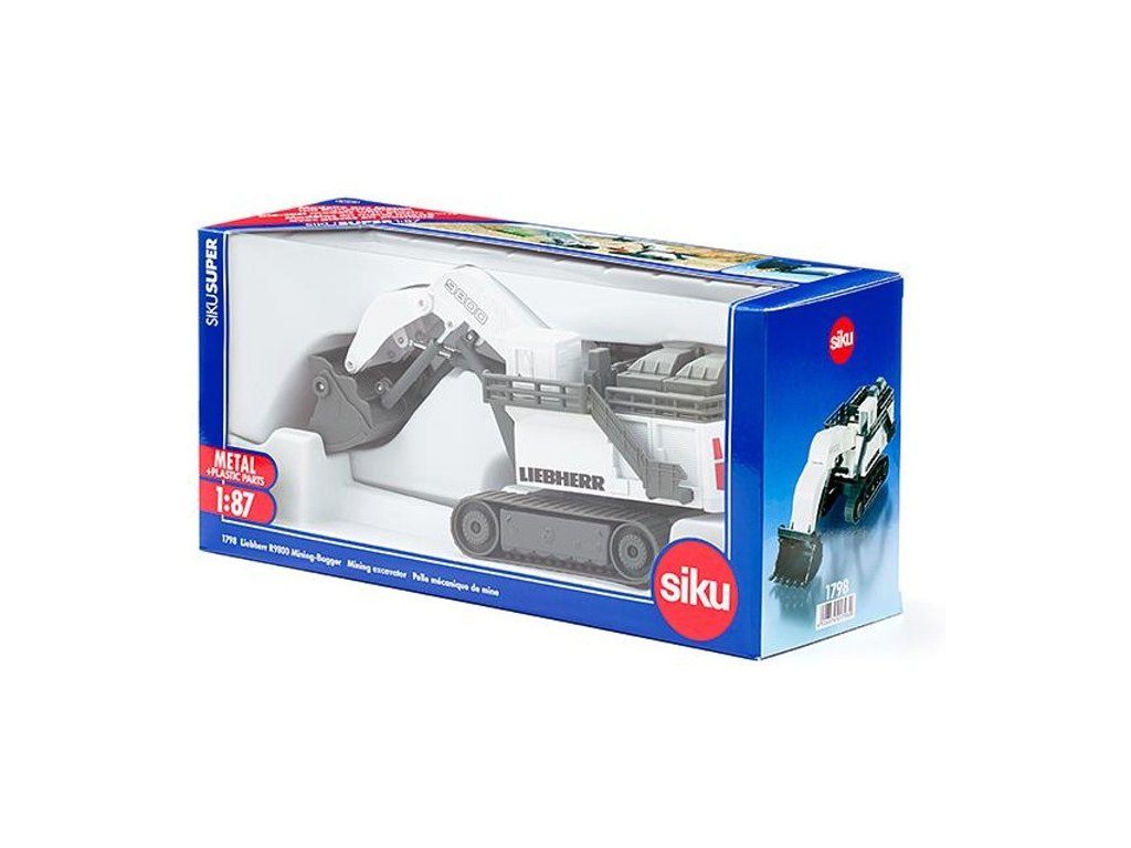 Kovový model důlního bagru Liebherr R9800 v měřítku 1:87 od značky Siku. Model má pogumované pohyblivé pásy, funkční rameno nakladače s výklopnou lžící a maketami pístů. Vhodné pro hraní i sběratelství. Kvalitní zpracování z kovu a plastu.