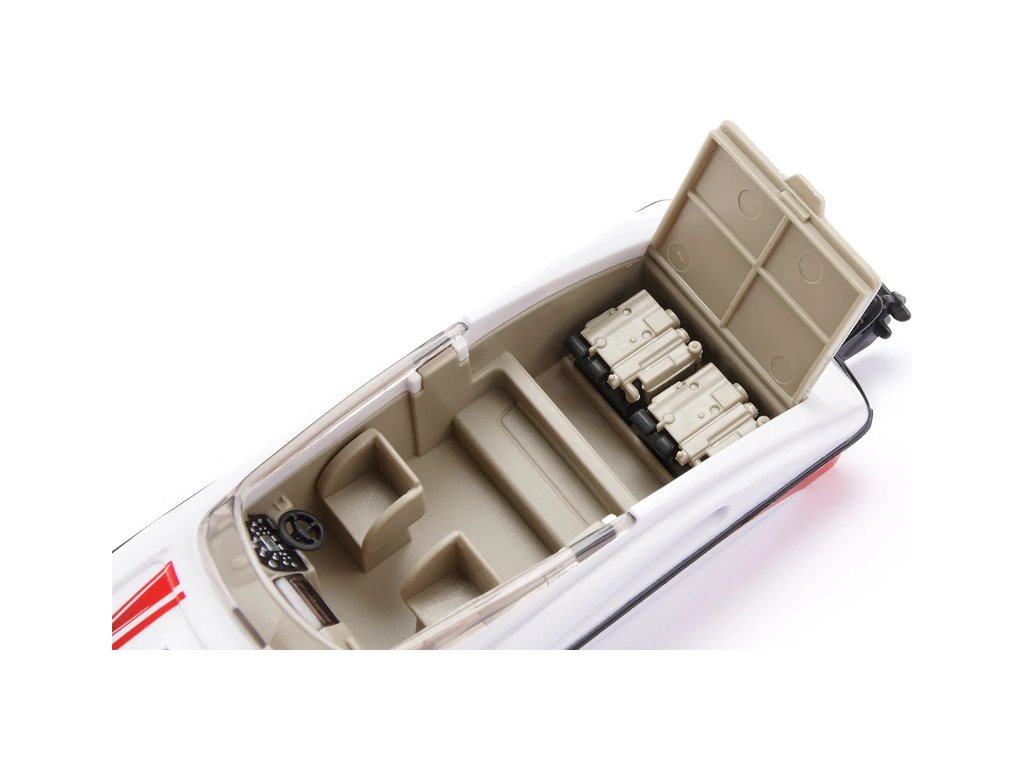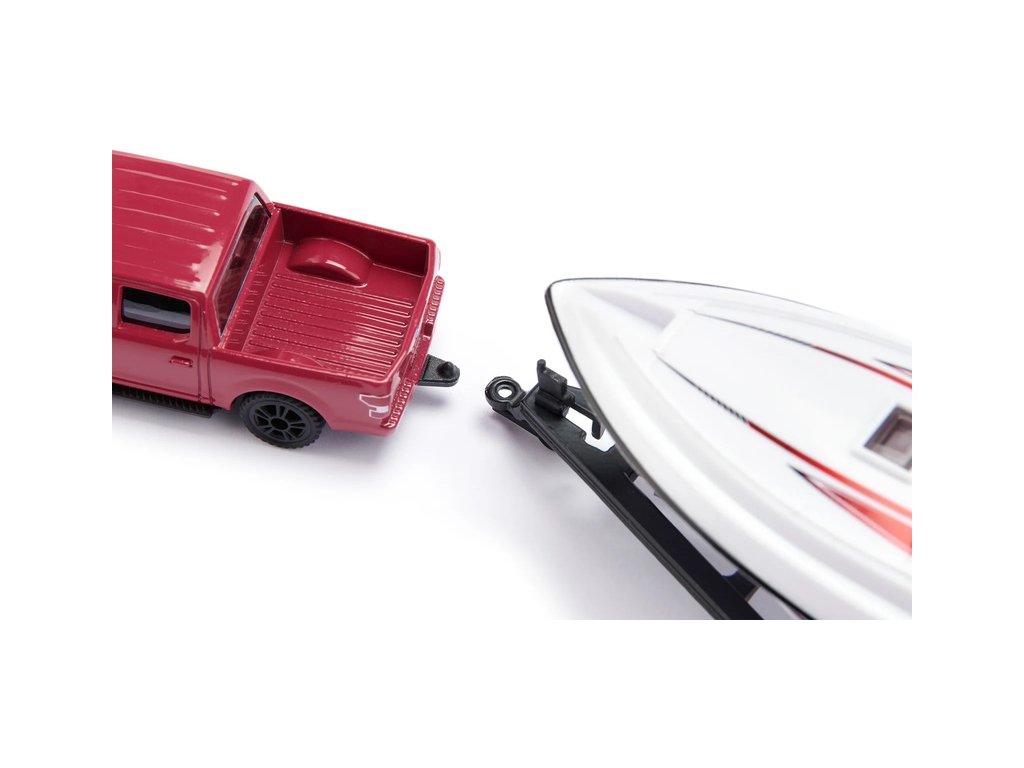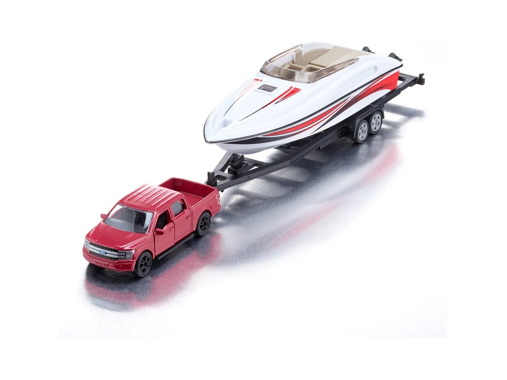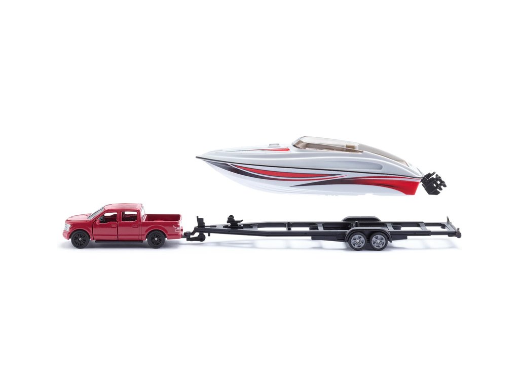 Kovový model auta Ford F150 s přívěsem a rychlostním člunem, v měřítku 1:50 od značky Siku. Auto má otevírací dveře, gumová kola a tažné zařízení. Rychlostní člun je plovoucí maketa a obsahuje odklopné víko s maketou motoru. Vhodné pro hraní i sběratelství. Kvalitní zpracování z kovu a plastu.