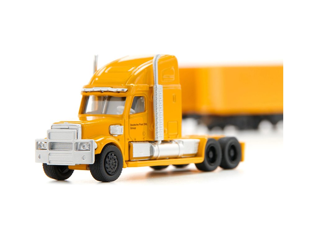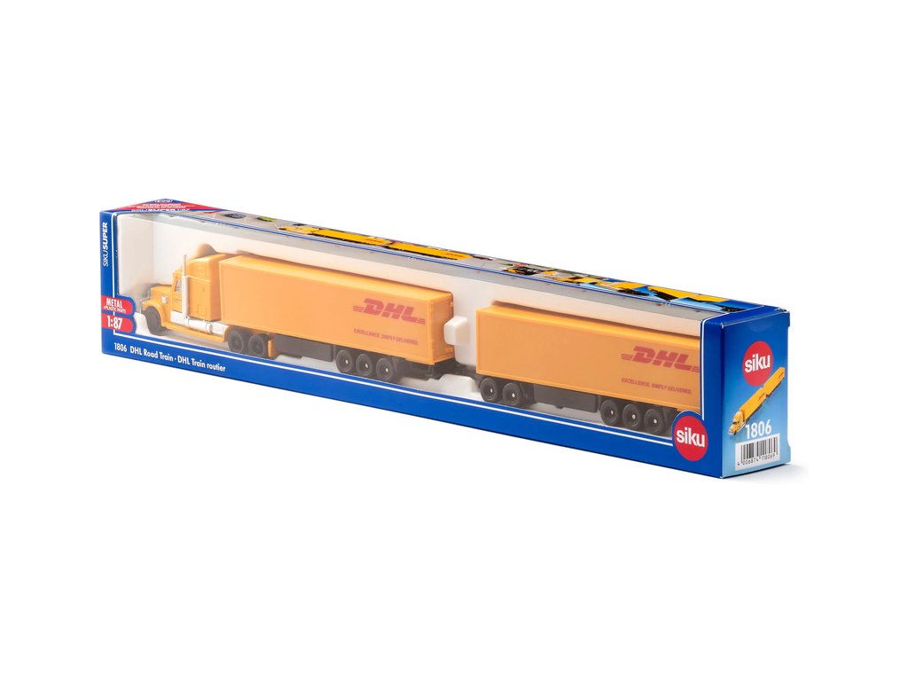 Kovový model kamionu s návěsem a přívěsem DHL v měřítku 1:87 od značky Siku. Model má detailní zpracování, chromované prvky na tahači, přívěs a návěs mají otevírací dveře, pogumované pneumatiky. Vhodné pro hraní i sběratelství. Kvalitní zpracování z kovu a plastu.