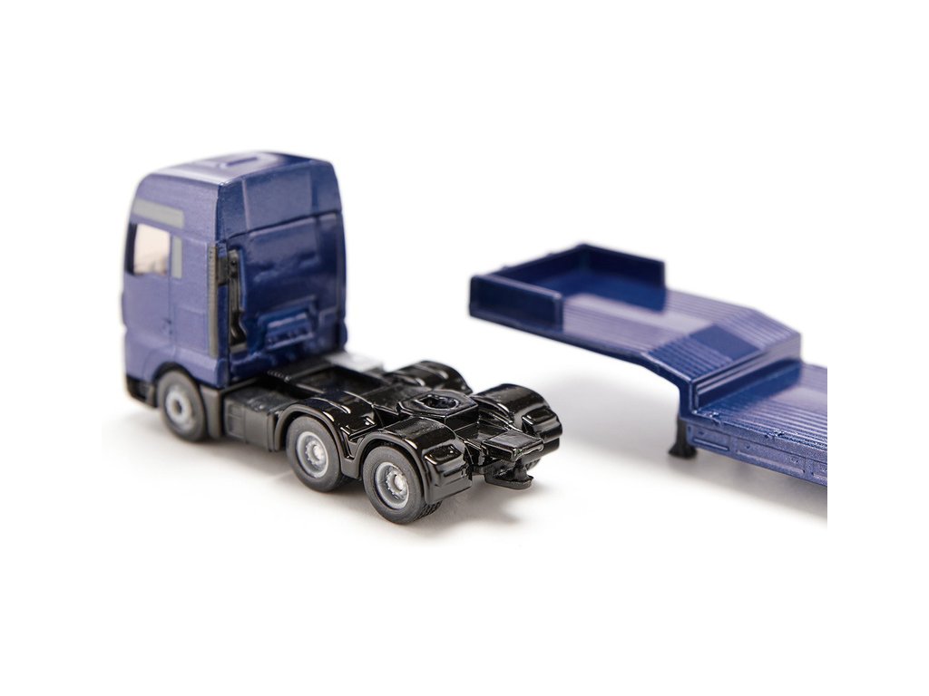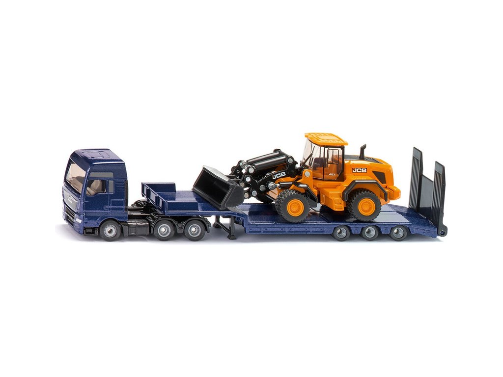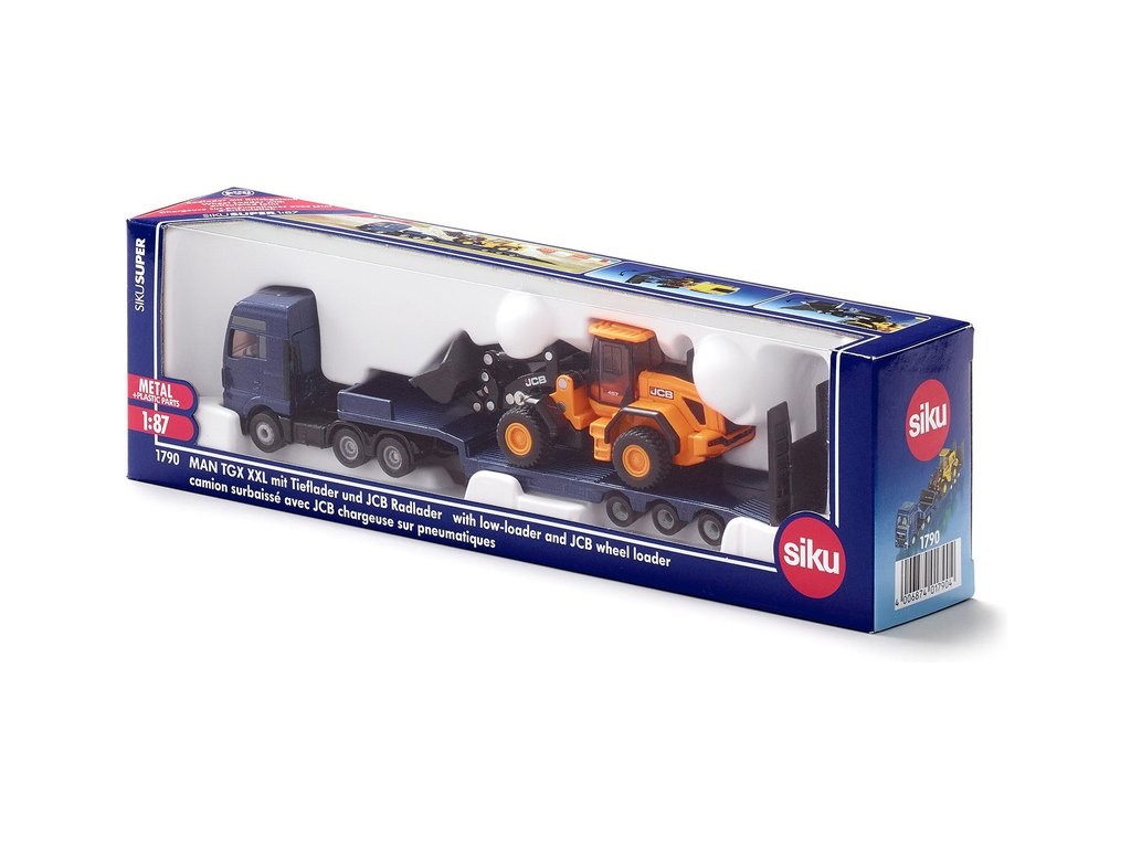 Kovový model tahače MAN s nakladačem JCB 457 WLS v měřítku 1:87 od značky Siku. Tahač obsahuje třínápravový návěs s výklopnou stojkou a sklopnými nájezdy. Nakladač má kloubové zatáčení, přední pohyblivé rameno s výklopnou lžící a maketami pístů, pogumovaná kola. Vhodné pro hraní i sběratelství. Kvalitní zpracování z kovu a plastu.