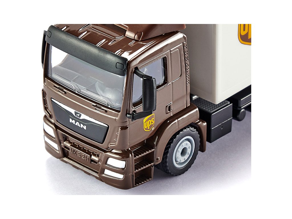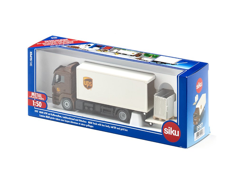 Kovový model auta MAN UPS se zvedací zadní plošinou v měřítku 1:50 od Siku. Otevírací zadní dveře s funkční nakládací plošinou. Včetně makety palety a přepravního boxu pro balíky. Vhodné pro hraní i sběratelství. Kvalitní zpracování z kovu a plastu.