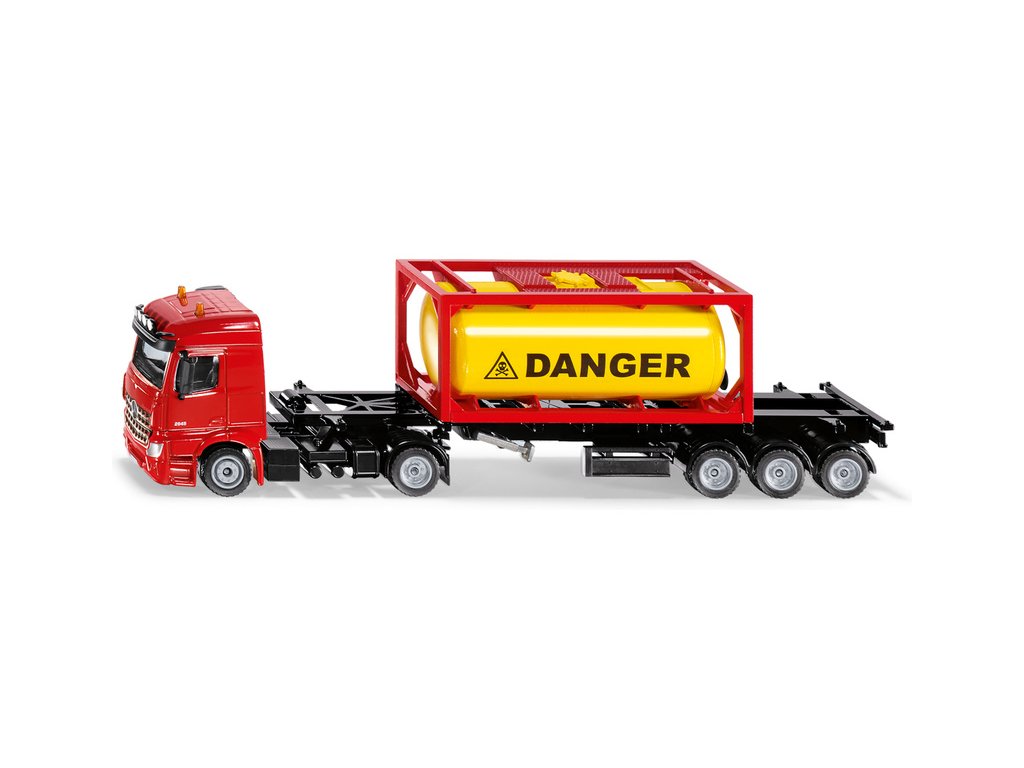Kovový model kamionu Mercedes-Benz LKW s cisternou v měřítku 1:50. Cisterna je osazena do kontejnerového rámu, lze ji vykládat a stohovat, víčko lze otevřít a cisternu naplnit vodou. Návěs je odpojitelný a na výklopných nohách může stát. Na návěs lze uložit dva kontejnery, např. Siku 3921. Kabinu lze odklopit pro pohled na motor. Vhodné pro hraní i sběratelství. Kvalitní zpracování z kovu a plastu.