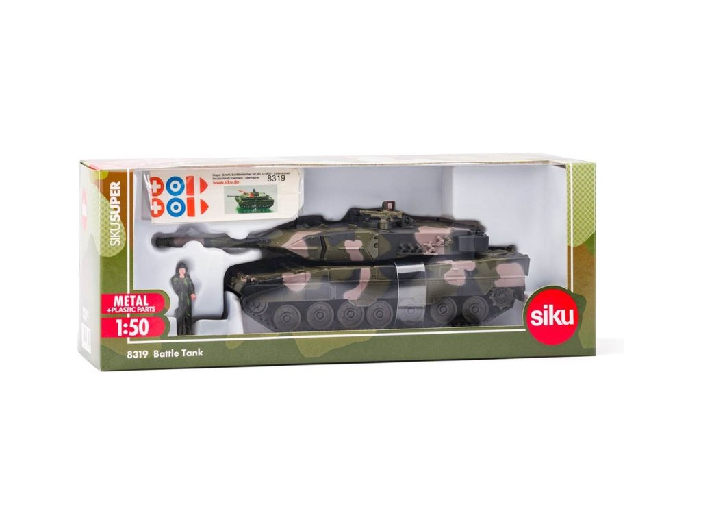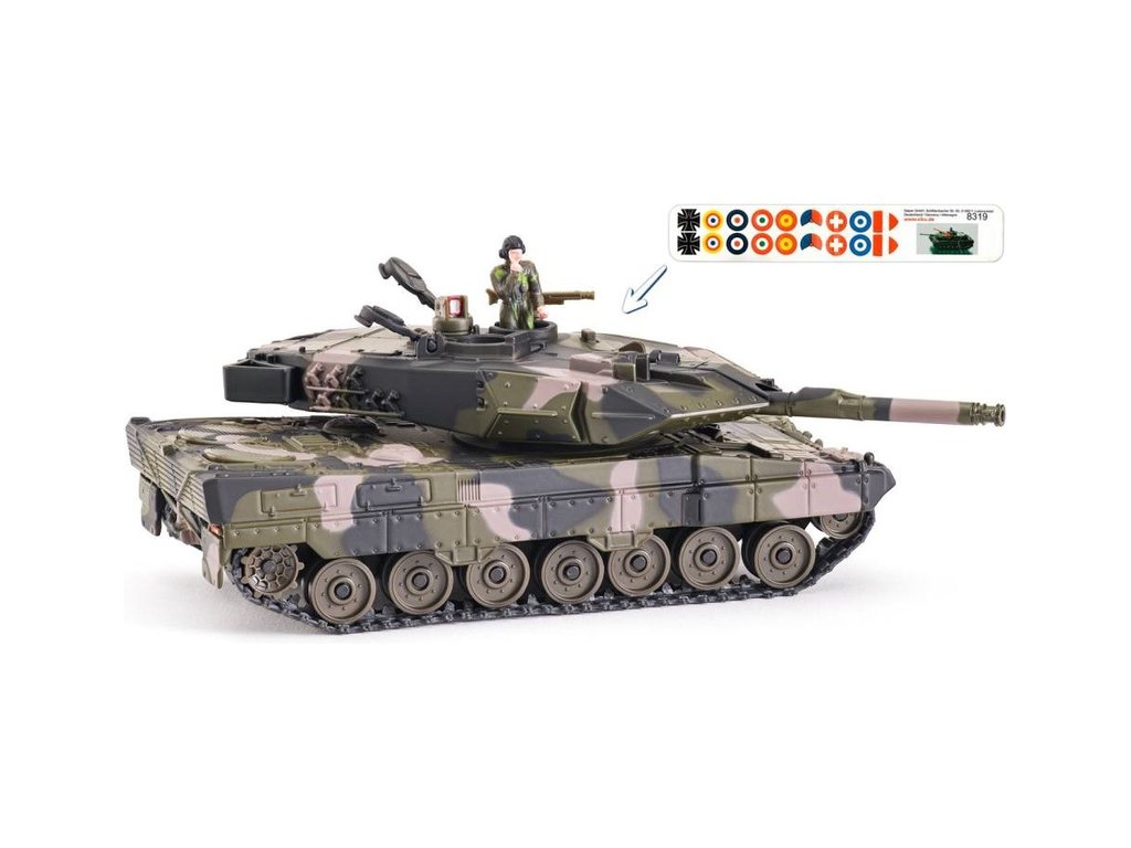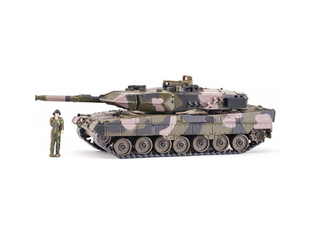Kovový model tanku Leopard v měřítku 1:50. Bojový tank má pohyblivou dělovou věž a dělo, otáčející se pásy. Včetně figurky vojáka. Vhodné pro hraní i sběratelství. Kvalitní zpracování z kovu a plastu.
