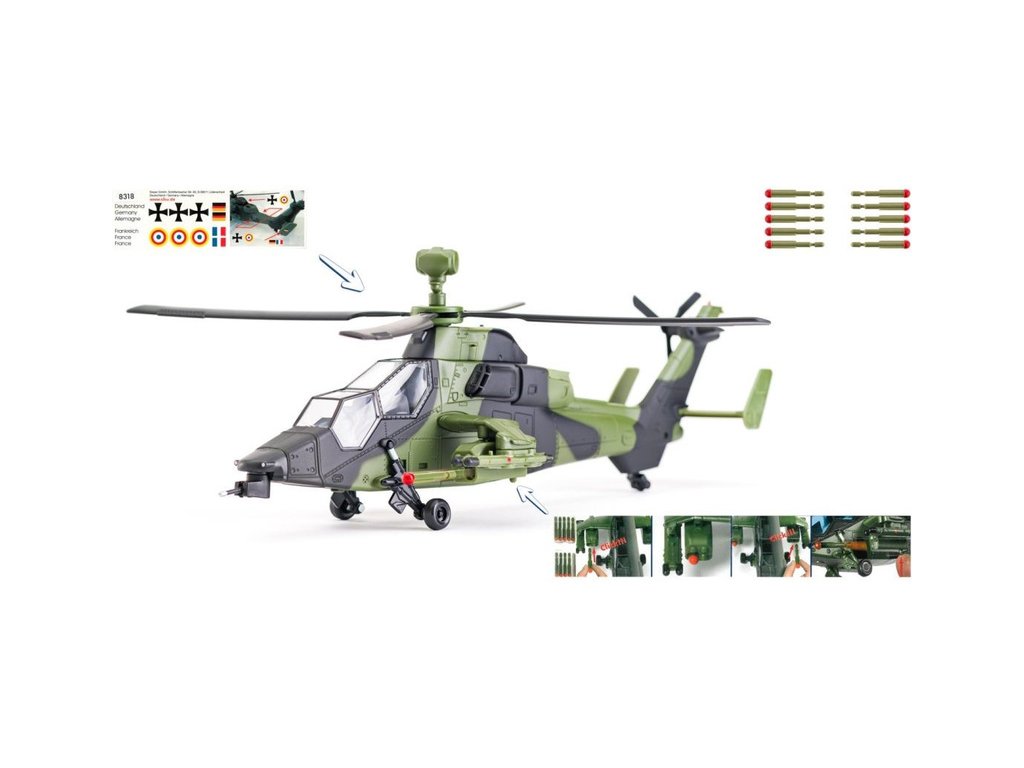 Kovový model bojového vrtulníku v měřítku 1:50. Vrtulník má otočné vrtule hlavního i ocasního rotoru a je vybaven závěsnými střelami s pružinovým mechanismem, pro možnost vystřelení. Vhodné pro hraní i sběratelství. Kvalitní zpracování z kovu a plastu.