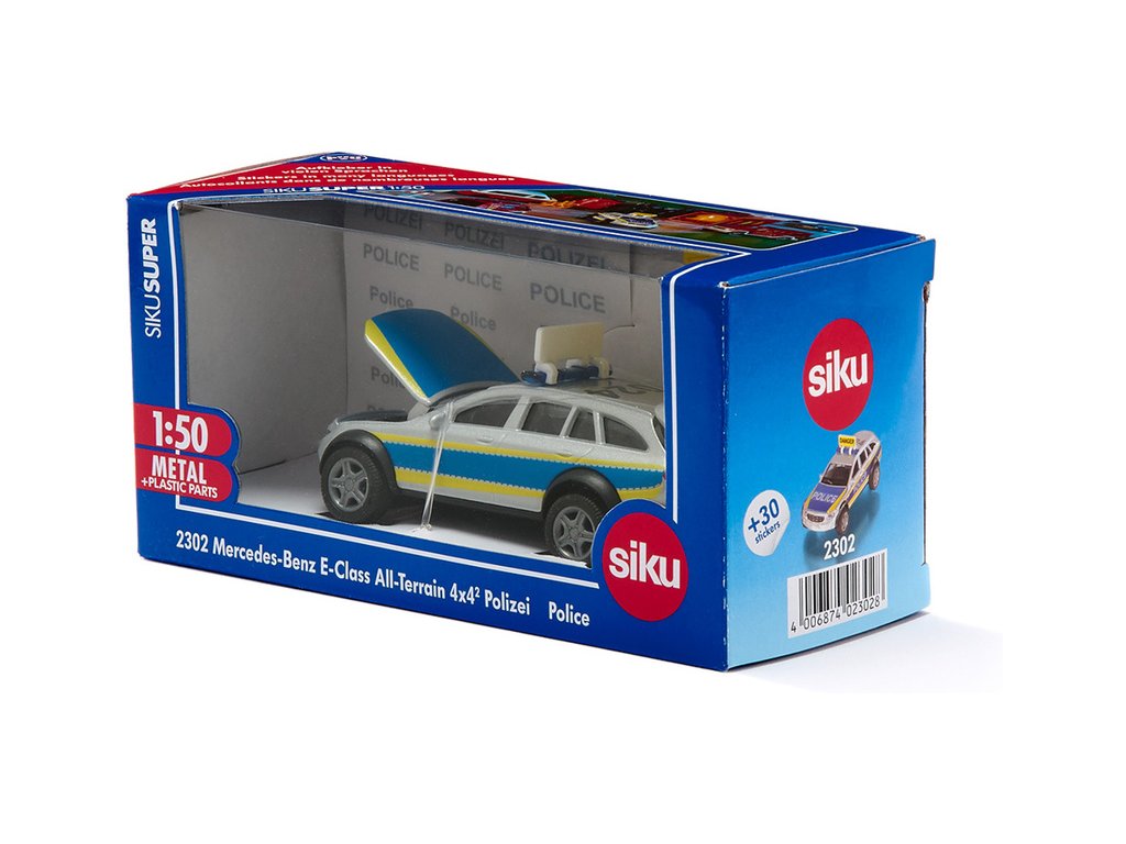 Kovový model policejního auta Mercedes Benz E-Class All Terrain 4x4 v měřítku 1:50 od Siku. Funkční odpružení, otevírací kapota a zadní dveře, výměnná kola. Acrh samolepek. Vhodné pro hraní i sběratelství. Kvalitní zpracování z kovu a plastu.