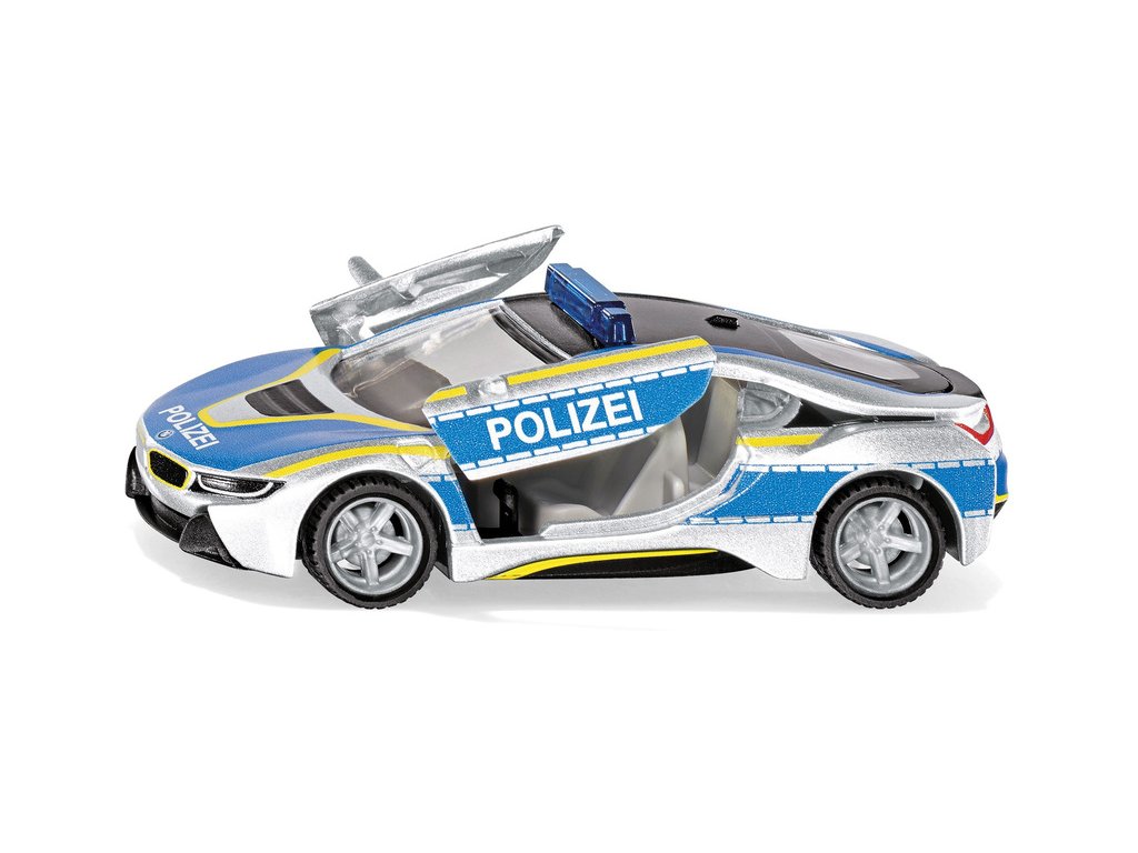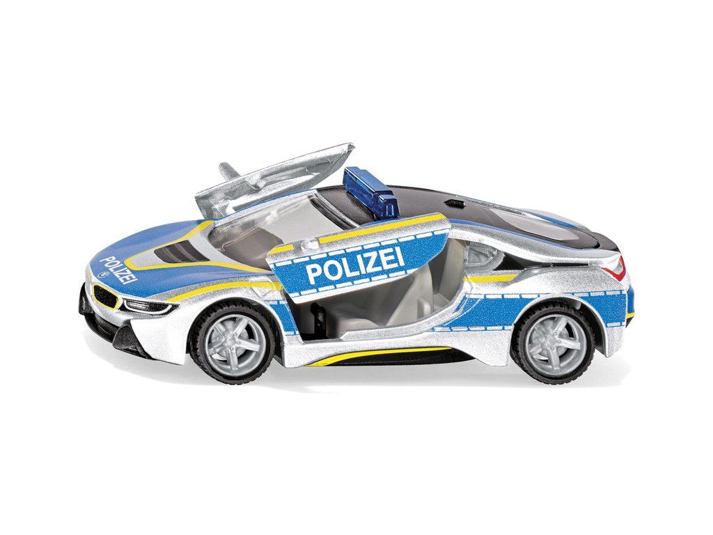 Kovový model policejního auta BMW i8 v měřítku 1:50. Otevírací motýli boční dveře, výměnná kola. Maketa supersportovního vozu v detailním designu policie. Vhodné pro hraní i sběratelství. Kvalitní zpracování z kovu a plastu.