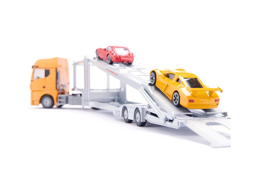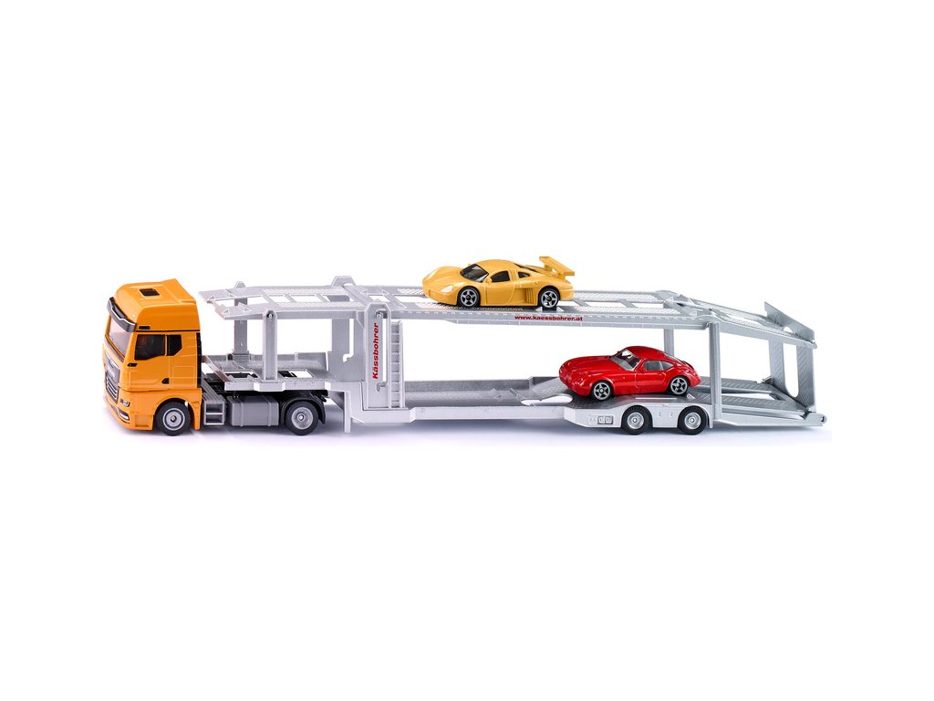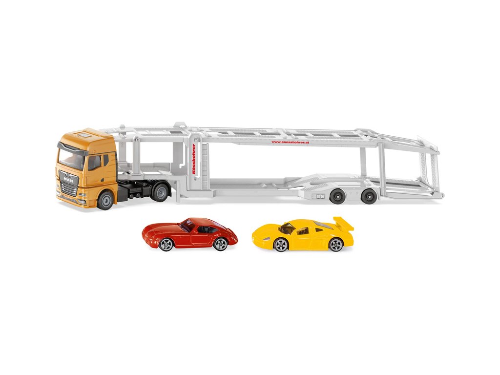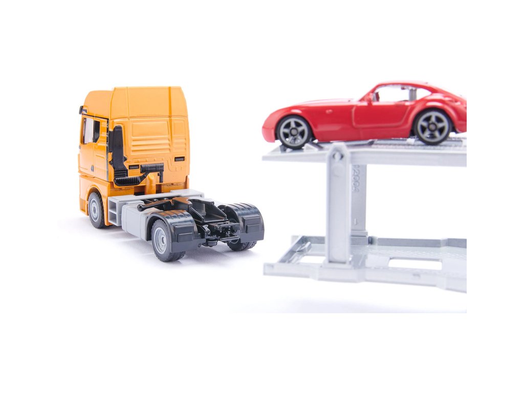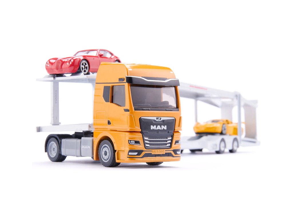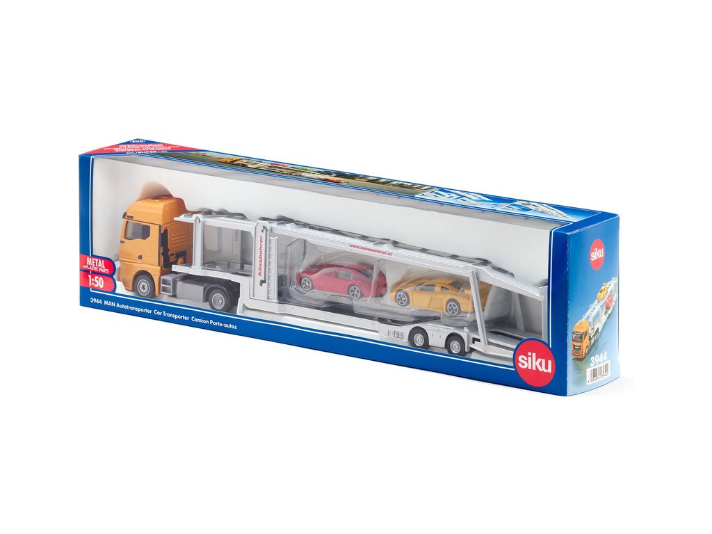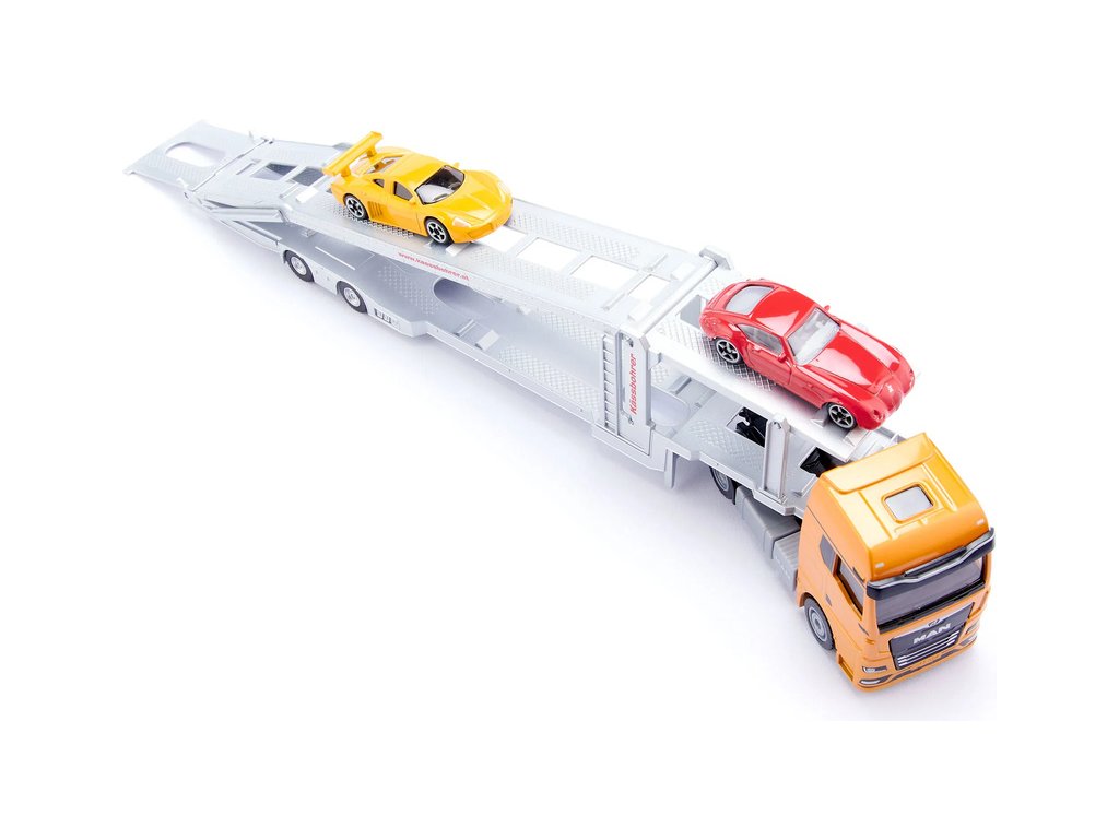 Kovový model nákladního auta MAN s transportním návěsem a dvěma modely aut v měřítku 1:50 od značky Siku. Dvounápravový návěs má sklopný nájezd a celou horní rampu. Vhodné pro hraní i sběratelství. Kvalitní zpracování z kovu a plastu.