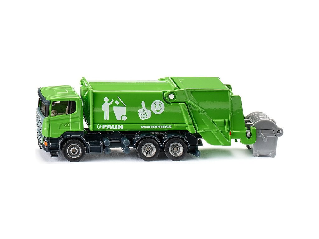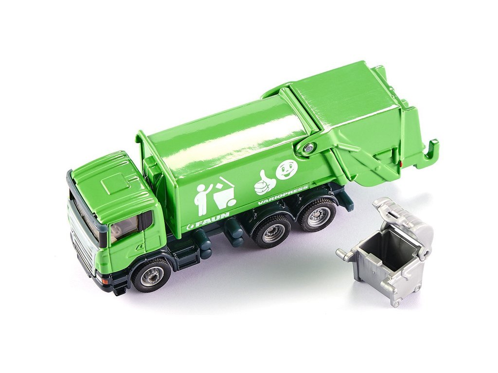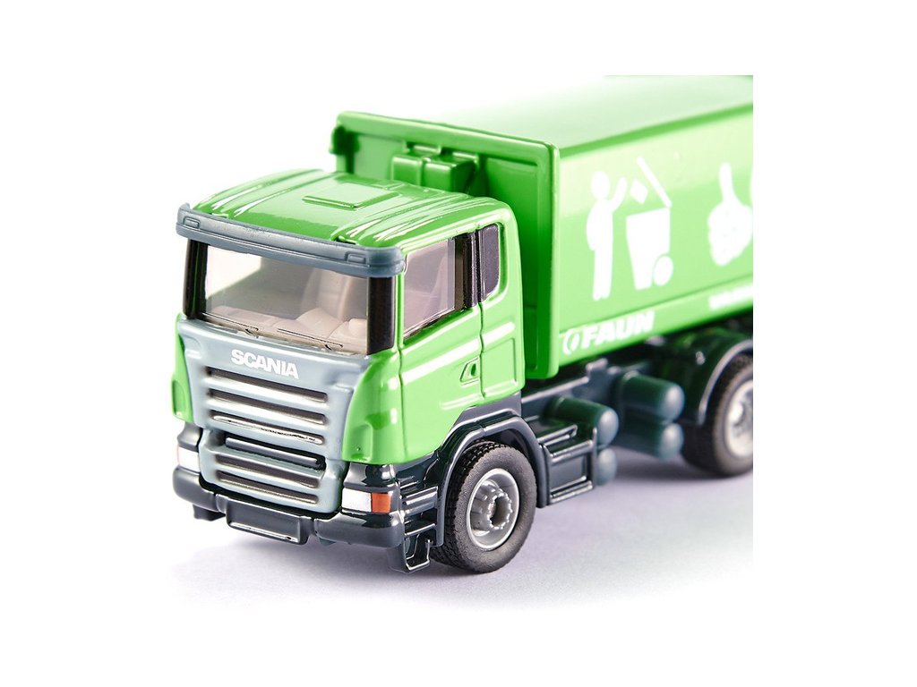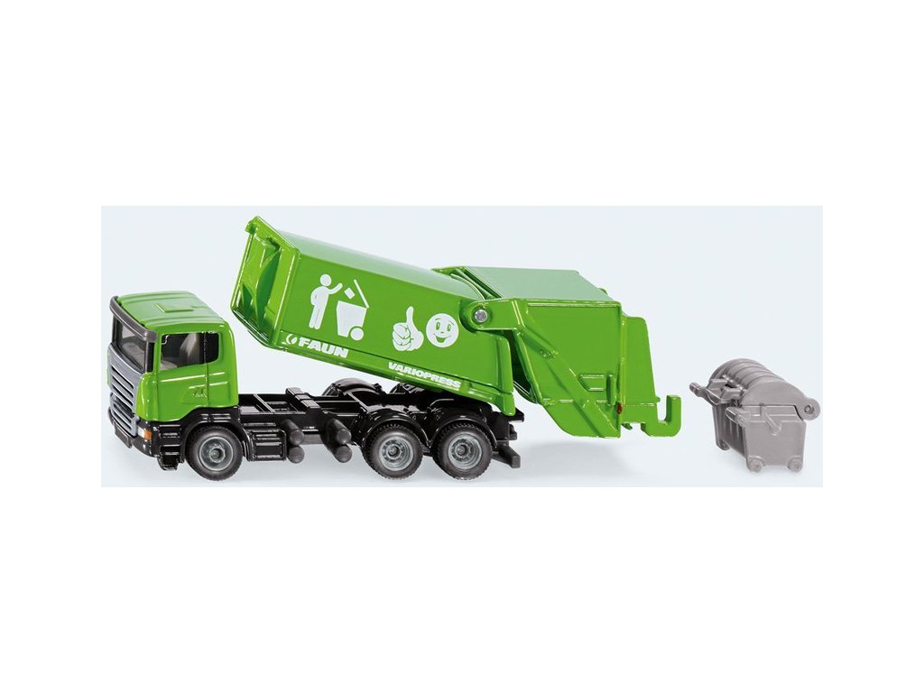 Kovový model popelářského auta Scania v měřítku 1:87 od značky Siku. Model obsahuje gumové pneumatiky, výklopnou korbu s otevíracím čelem a maketu kontejneru s otevíracím víkem. Vhodné pro hraní i sběratelství. Kvalitní zpracování z kovu a plastu.