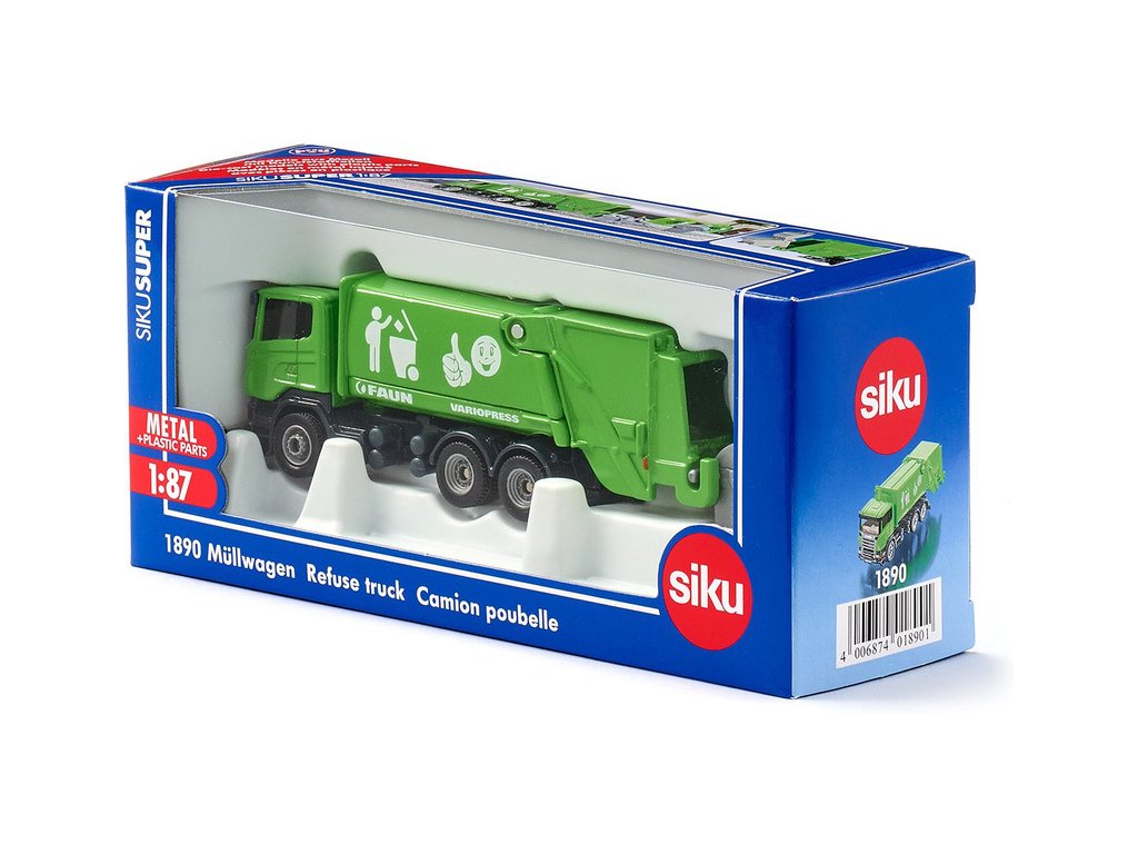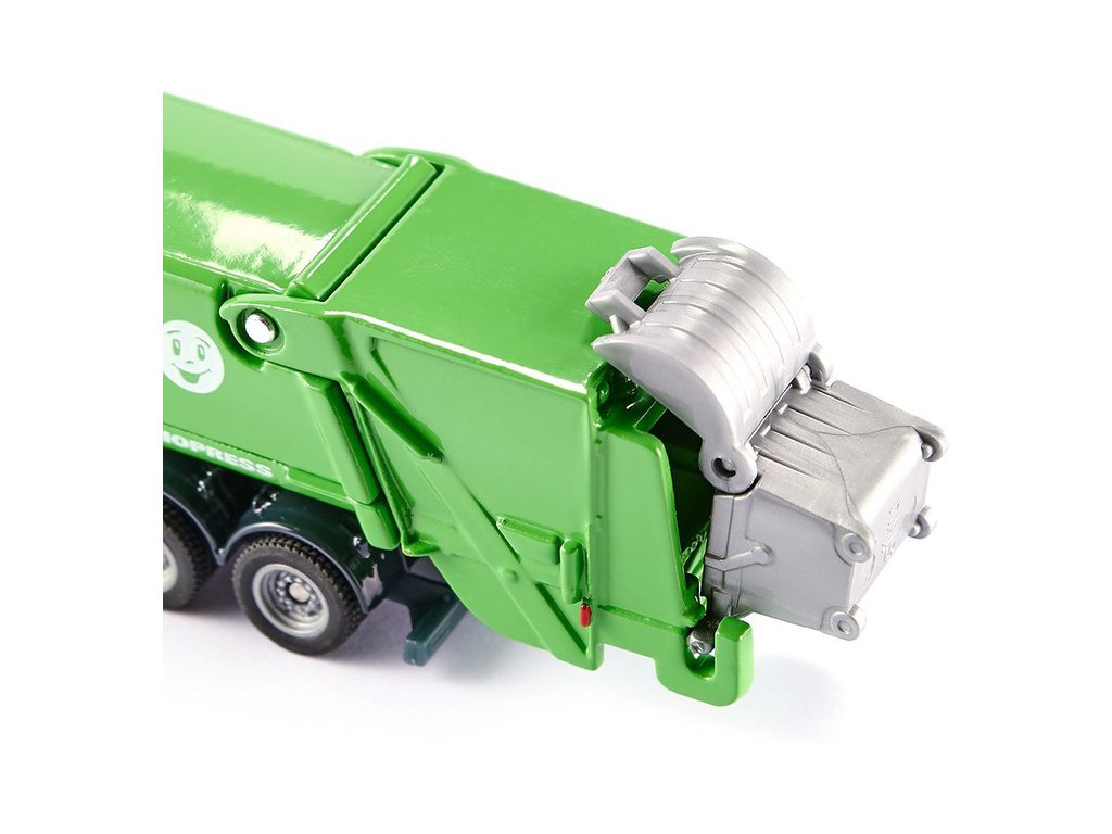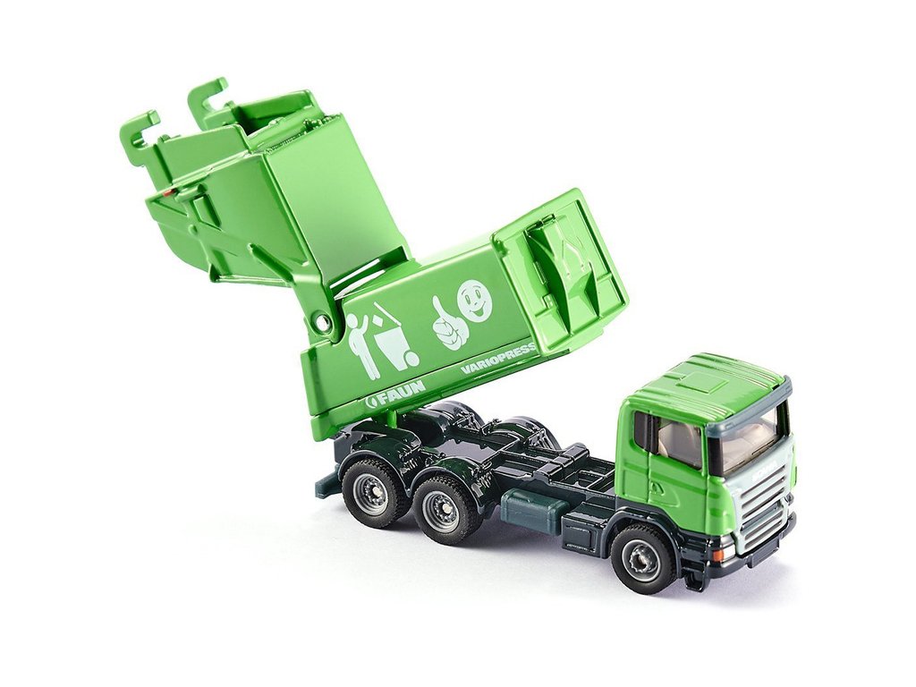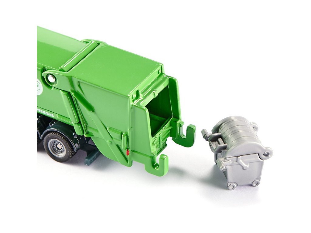 Kovový model popelářského auta Scania v měřítku 1:87 od značky Siku. Model obsahuje gumové pneumatiky, výklopnou korbu s otevíracím čelem a maketu kontejneru s otevíracím víkem. Vhodné pro hraní i sběratelství. Kvalitní zpracování z kovu a plastu.
