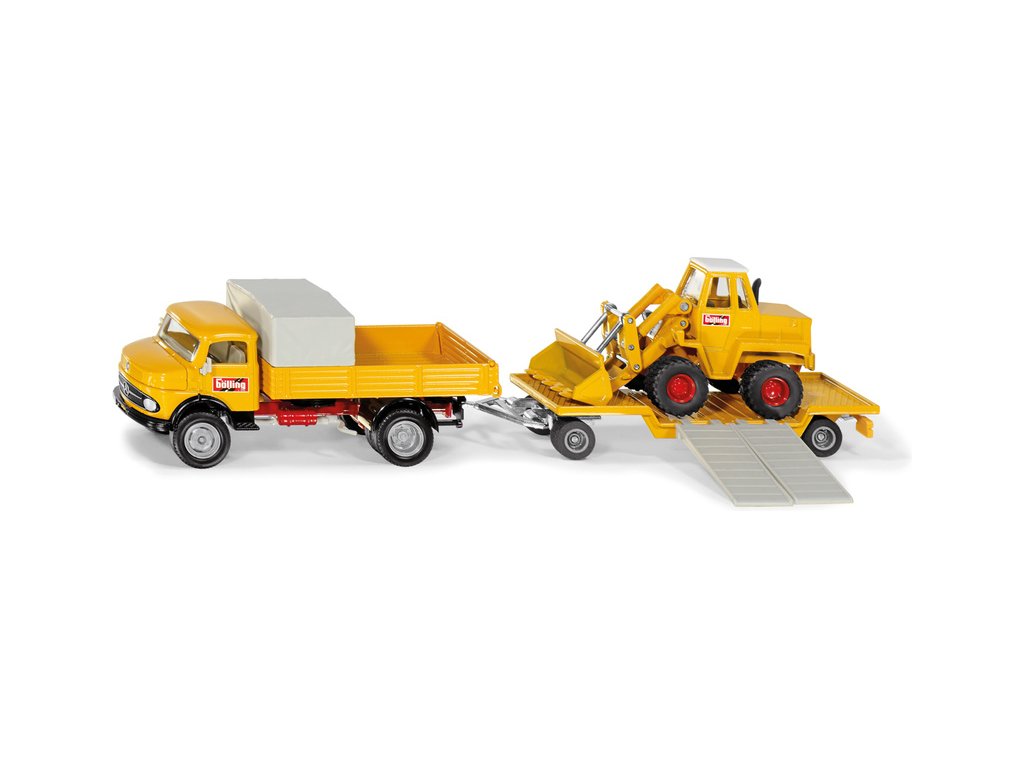 Kovový model auta Mercedes-Benz 710 s vlečkou převážející nakladač 411 Bölling v měřítku 1:50. Model má vyklápěcí korbu s funkčním čelem a otevírací kapotu. Návěs je s nájezdovou rampu. Nakladač má pohyblivé rameno se lžící. Vhodné pro hraní i sběratelství. Kvalitní zpracování.