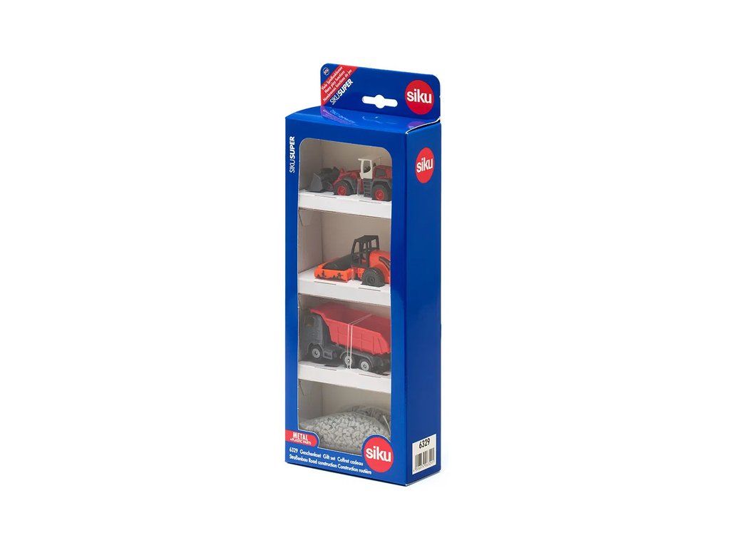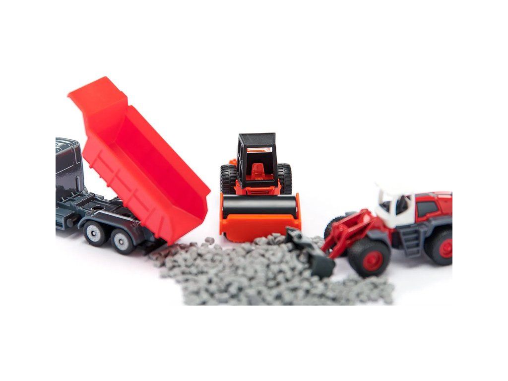 Sada kovový modelů aut - stavební stroje a příslušenství od značky Siku. Sada obsahuje nákladní auto s čirými okny a sklápěcí korbou, kolový nakladač s pohyblivým ramenem a nakládací lopatou, silniční válec. Součástí sady jsou šedé plastové kameny, které jsou ideální pro nakládání do sklápěče pomocí kolového nakladače. Vhodné pro hraní i sběratelství. Kvalitní zpracování z kovu a plastu.