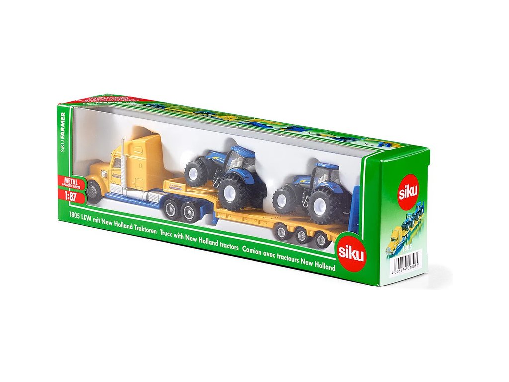Kovový model amerického tahače se dvěma traktory New Holland v měřítku 1:87 od značky Siku. Tahač obsahuje třínápravový návěs se sklopnými nájezdy. Kabiny traktorů jsou odnímatelné. Kola na modelech jsou gumová. Vhodné pro hraní i sběratelství. Kvalitní zpracování z kovu a plastu.