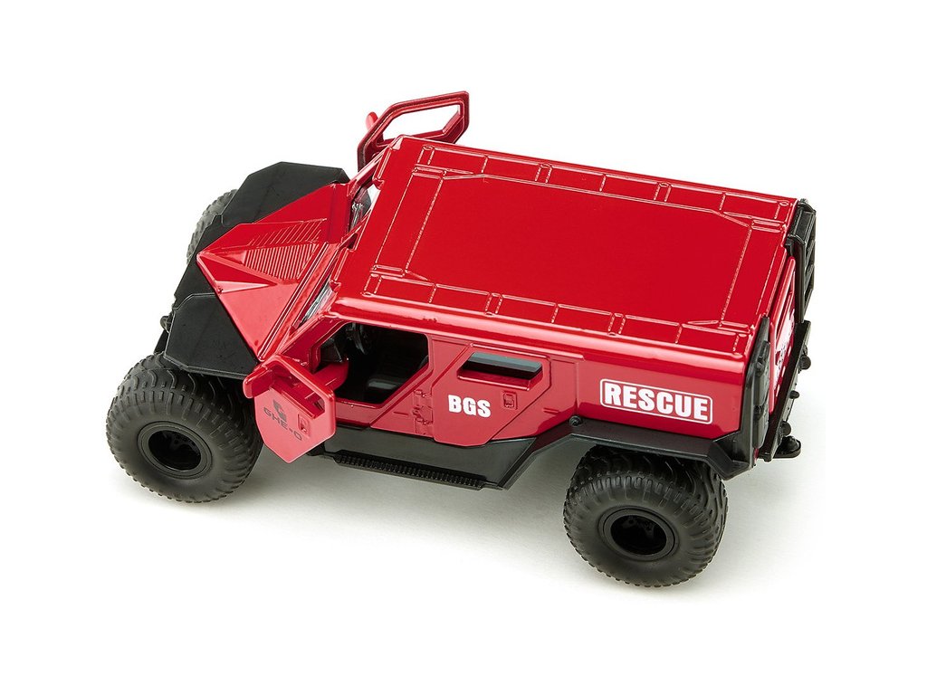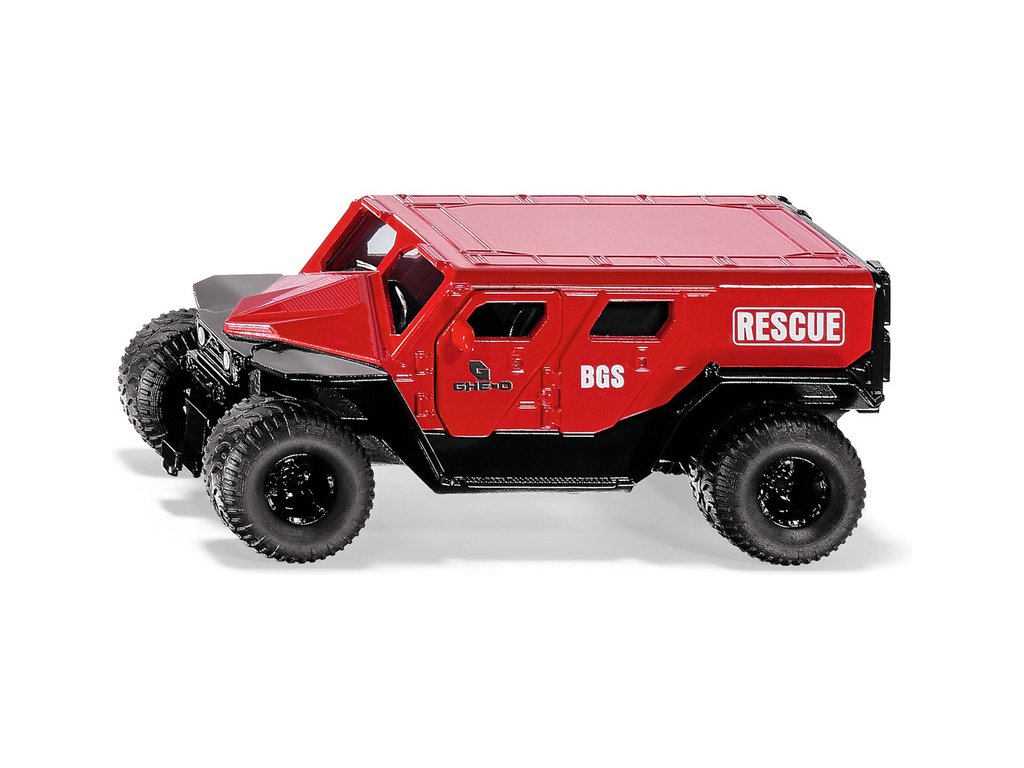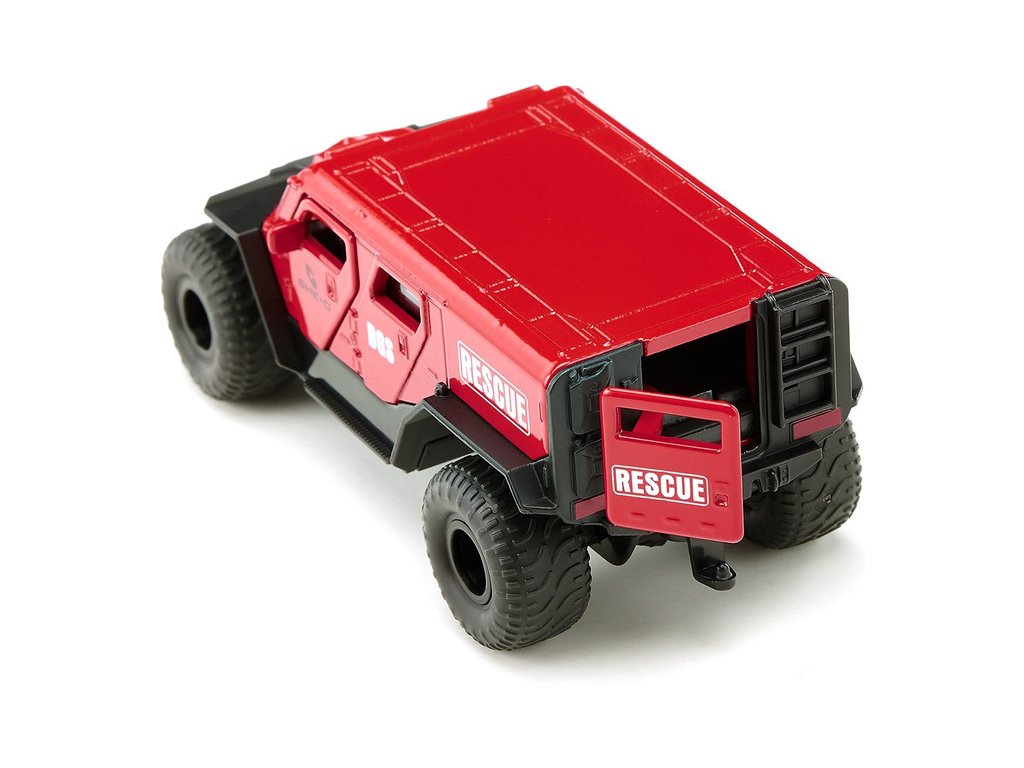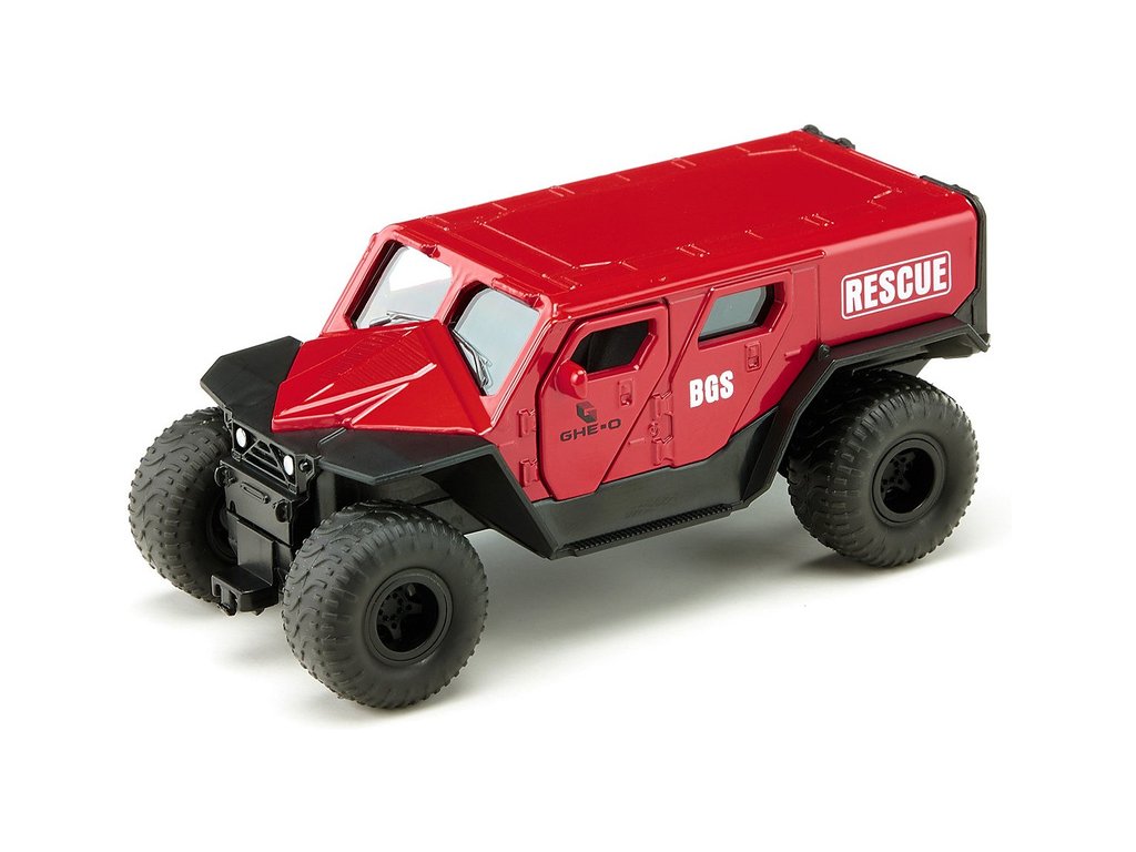 Kovový model záchranného terénního auta v měřítku 1:50. Má otevírací boční a zadní dveře. Funkční odpružení a výměnná kola. Vhodné pro hraní i sběratelství. Kvalitní zpracování z kovu a plastu.