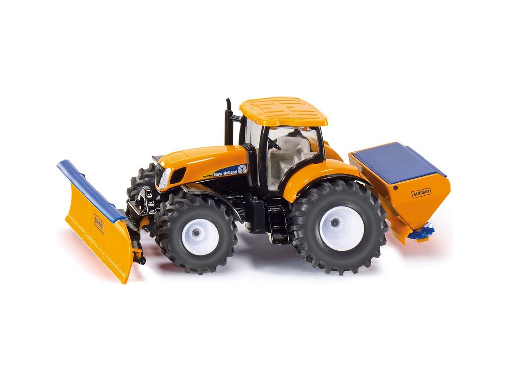Kovový model traktoru New Holland v měřítku 1:50 a v městské oranžové barvě. Obsahuje výbavu pro zimní údržbu - nastavitelnou přední radlici a zadní metací zařízení s otevíracím víkem. Oba nástavce a kabinu lze odejmout. Vhodné pro hraní i sběratelství. Kvalitní zpracování z kovu a plastu.