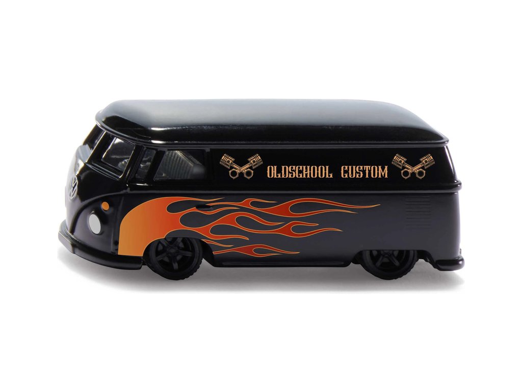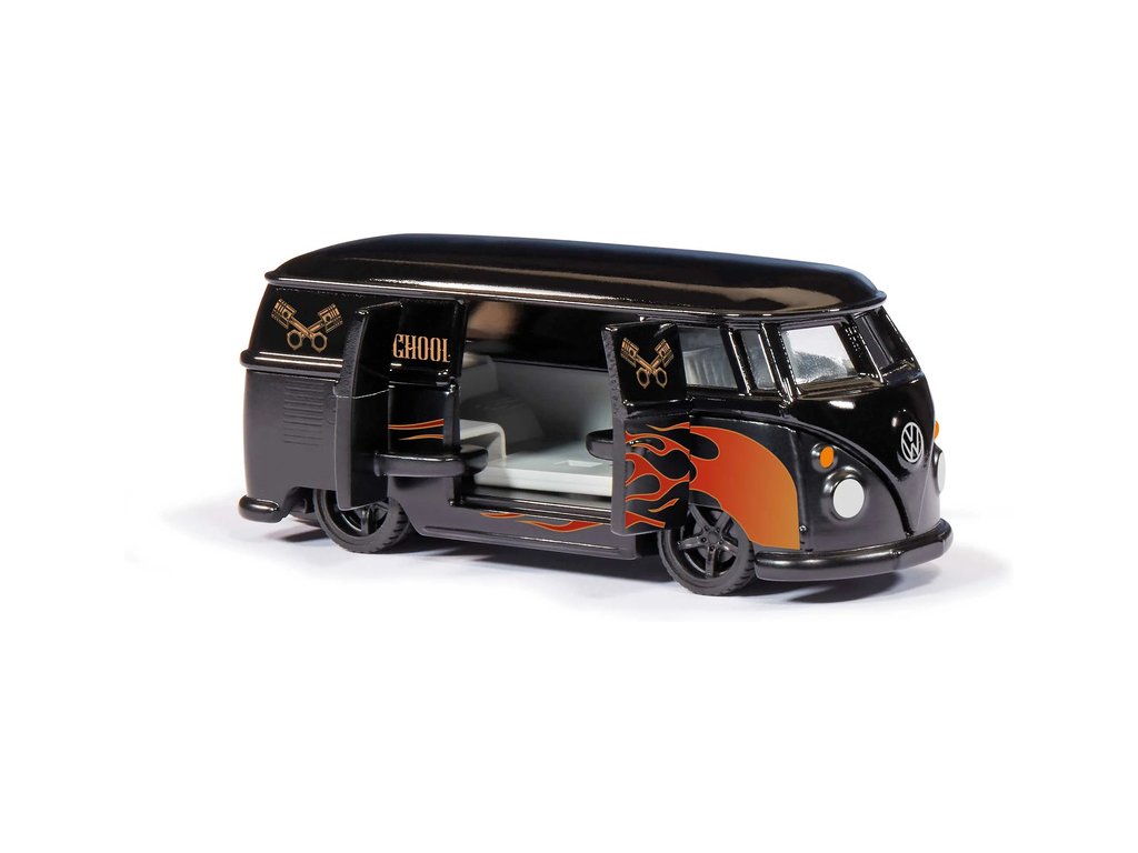 Kovový model minivanu Volkswagen T1 v měřítku 1:50. Legendární model z 50. let, oblíbený v komunitě hippies, jako model s detailním zpracováním a otevíracími dveřmi na pravé straně. Černé barva s plameny. Vhodné pro hraní i sběratelství. Kvalitní zpracování z kovu a plastu.