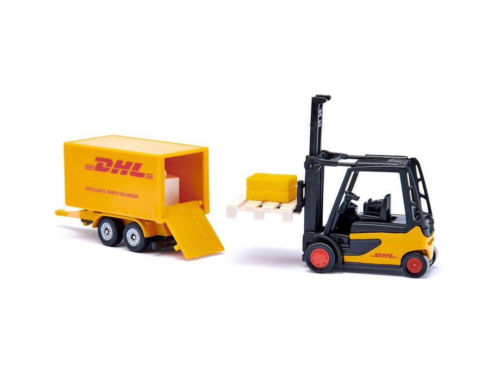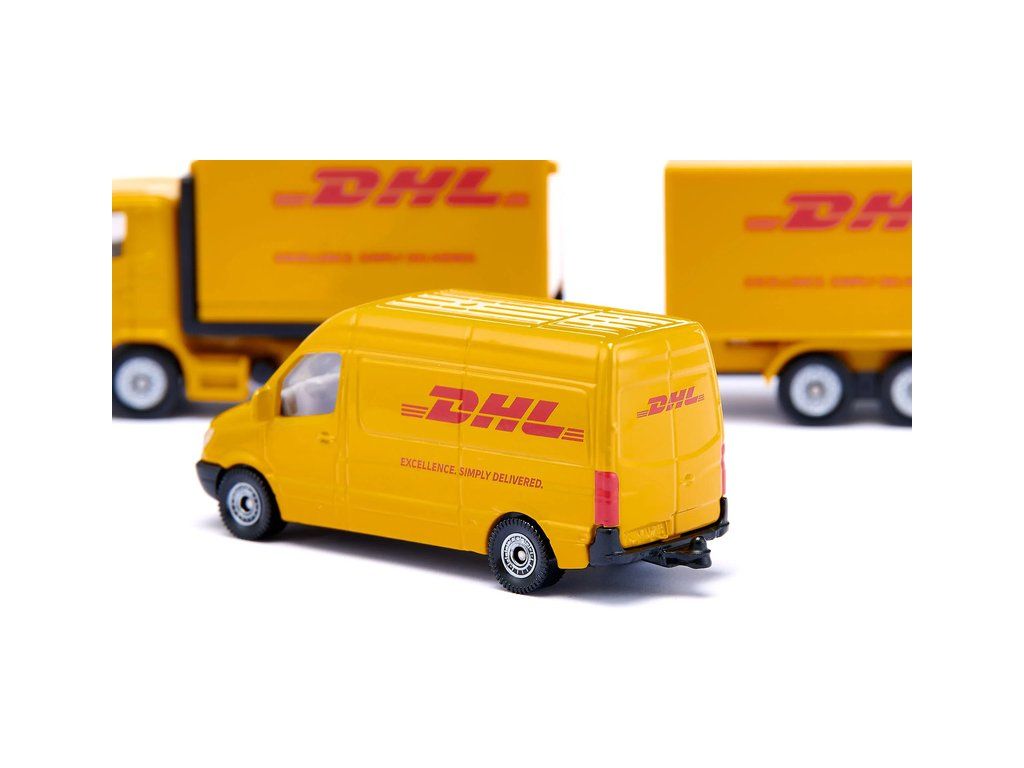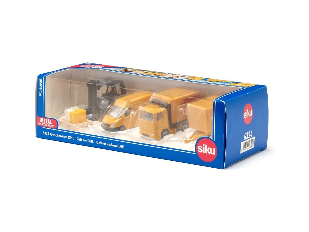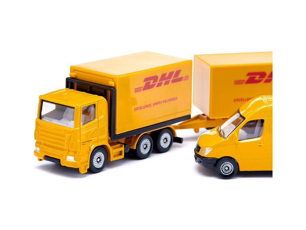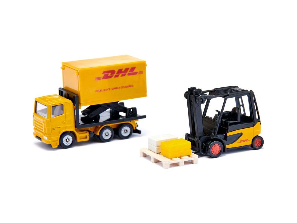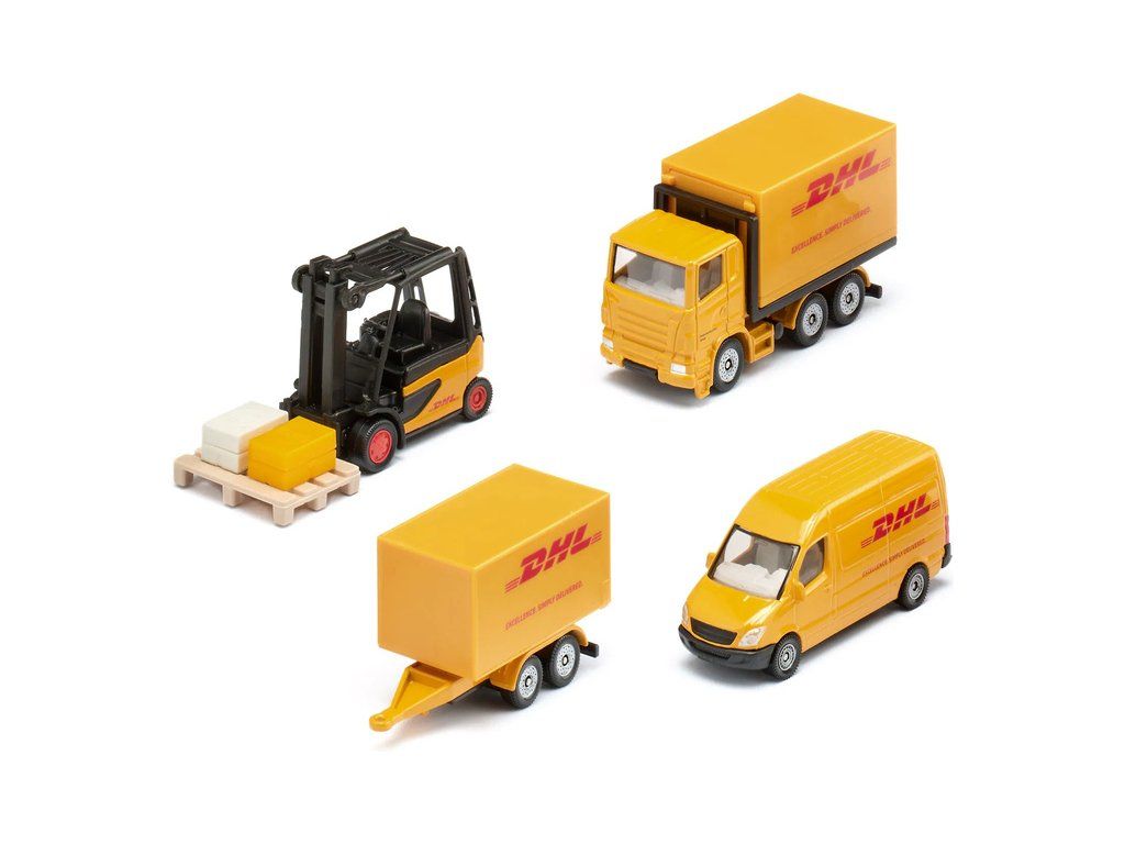 Sada kovových modelů DHL od značky Siku. Sada obsahuje kamion se zdvižným nůžkovým mechanismem korby a s odpojitelným přívěsem, dodávku a vysokozdvižný vozík s pohyblivými vidlemi a paletou s kufry. Modely mají čirá okna. Vhodné pro hraní i sběratelství. Kvalitní zpracování z kovu a plastu.
