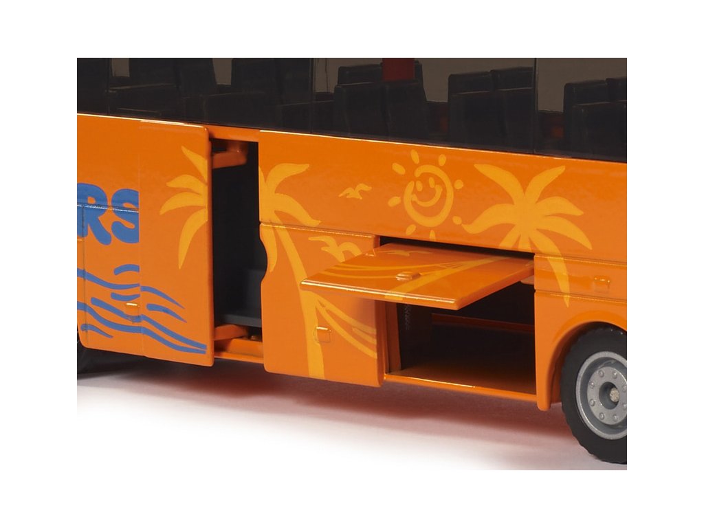 Kovový model zájezdového autobus Mercedes - Benz v měřítku 1:50. Má otevírací boční dveře, víko motoru a prostor pro zavazadla z obou stran, 3 nápravy s pogumovanými pneumatikami a poutavý prázdninový motiv. Vhodné pro hraní i sběratelství. Kvalitní zpracování z kovu a plastu.