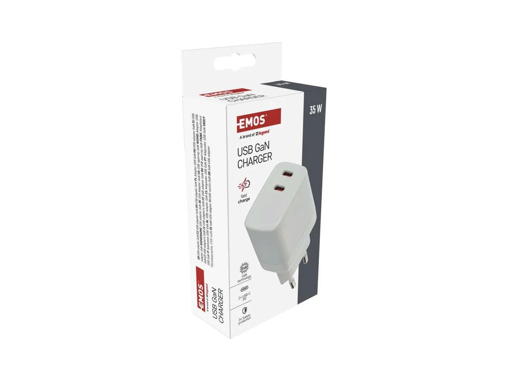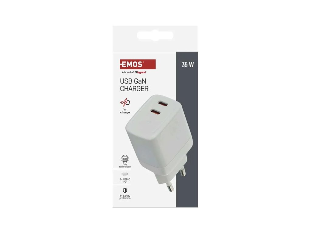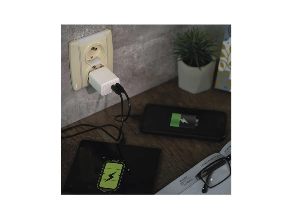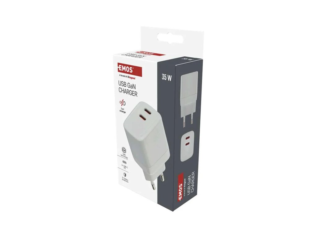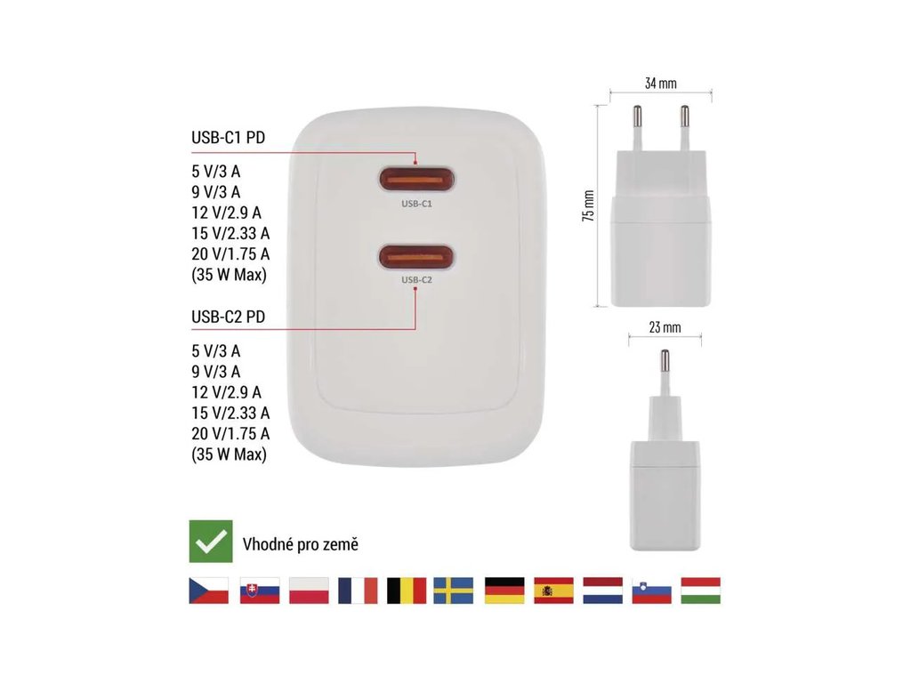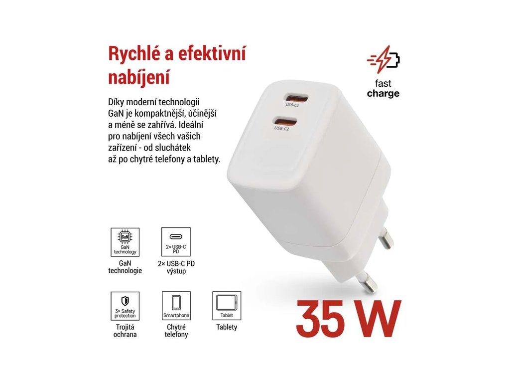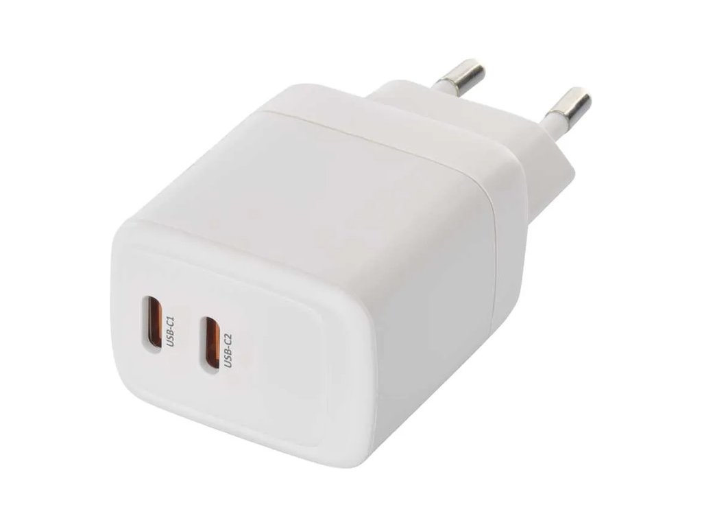 Výkonný univerzální síťový adaptér USB s výkonem až 35W a dvěma výstupy - 2x USB‑C. Adaptér zajistí rychlé a spolehlivé nabíjení a napájení telefonů, tabletů, notebooků, USB nabíječů a dalších zařízení. Tranzistory s Nitridem Galia poskytují vysokou účinnost při zachování kompaktních rozměrů. Automatické a efektivní rozdělení výkonu na jednotlivé výstupy dle požadavků připojených zařízení.