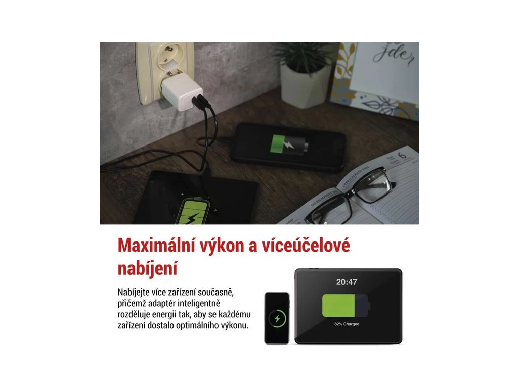 Díky podpoře technologie PD (Power Delivery - USB-C), adaptér dynamicky upravuje napětí (5V, 9V, 12V, 15V, 20V) a proud, podle vlastností připojeného zařízení, což umožňuje to nejrychlejší nabíjení.