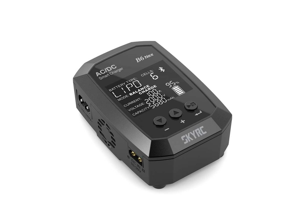 Miniaturní nabíječ B6 Nex 200W byl konstruován se snahou nabídnout inteligentní kapesní nabíječ se síťovým i stejnosměrným napájením s velkým výkonem a velmi jednoduchou a přehlednou obsluhou. B6 Nex umožňuje nabíjet a vybíjet běžné typy článků (NiCd, NiMH, LiPo, LiHV, Li-ion, LiFe, Pb), navíc je vybaven vestavěným šestikanálovým balancerem, který zajišťuje velmi bezpečné nabíjení lithiových akumulátorů. Nabíječ je vybaven Bluetooth 5.0 rozhraním, které vám po připojení k aplikaci SkyCharger nainstalované na vašem smartphonu (iOS i Android) poskytne možnost komfortního a velice přehledného nastavování parametrů, řízení a sledování průběhu nabíjení/vybíjení.
