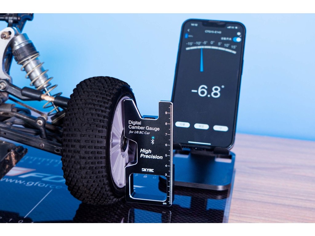 Digitální sklonoměr CTG-016 SkyRC je zařízení pro měření úhlů na kolech a nápravách modelů RC aut v měřítku 1:8. Velmi jednoduše, s vysokou přesností a rozlišením dokáže měřit příčný sklon kol, sbíhavost/rozbíhavost apod. S aplikaci RC Gears na smartphonu připojeném pomocí Bluetooth potom můžete úhly měřit a zobrazovat v grafické i digitální podobě.
