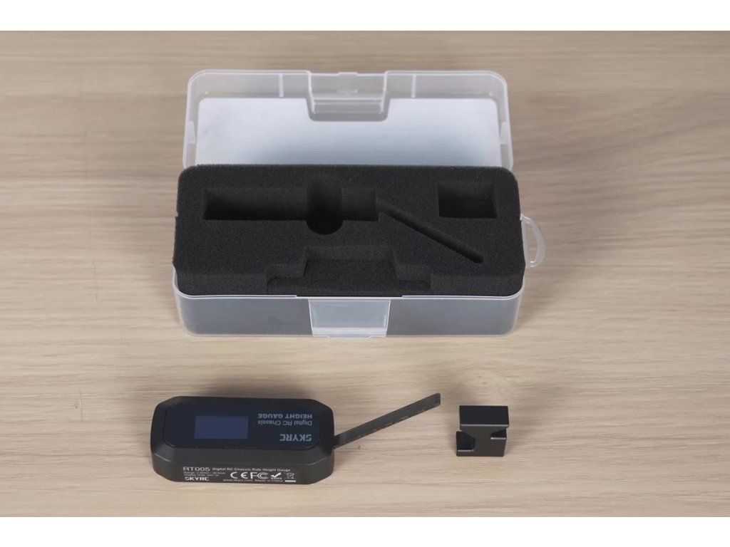 Digitální měřič světlé výšky je určen pro přesné a reprodukovatelné měření světlé výšky podvozků RC aut. Vyhovuje pro celou řadu měřítek RC aut od 1:24 po 1:8; poskytuje digitální údaj pro usnadnění nastavování podvozku, tlumičů a předstartovní přípravu.