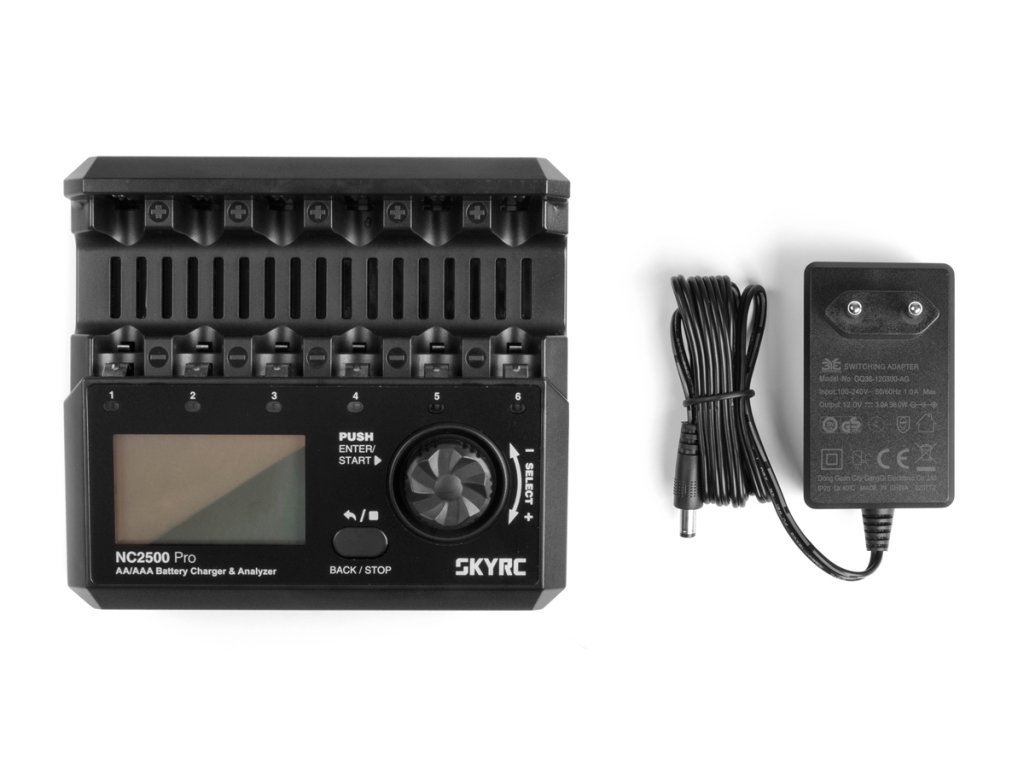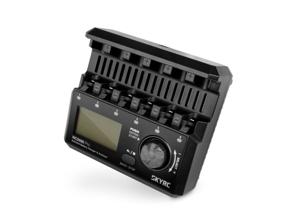 Nabíjení: NC 2500 Pro umožňuje současně nabíjet, vybíjet, formovat nebo oživovat až šest tužkových nebo mikrotužkových akumulátorů. Parametry probíhajícího procesu (nabíjecí/vybíjecí proud, nabitý/vybitý náboj, napětí akumulátoru, uplynulý čas) jsou průběžně zobrazovány pro všechny kanály na LCD displeji. LED indikátory u každého kanálu signalizují dobrý kontakt vloženého článku a provozní režim vybíjení nebo nabíjení. Provoz kanálů NC2500 Pro je synchronní – stačí vložit 1-6 akumulátorů stejného druhu, zadat parametry nabíjení nebo jiného provozního režimu a poté jedním stiskem tlačítka odstartovat stejný proces pro všechny „obsazené“ kanály. (Pokud požadujete možnost v každém kanálu používat jiný nabíjecí/vybíjecí program, volte nabíječ Sky RC NC2200.) Při nabíjení NC2500 Pro bere ohled i na vnitřní odpor článků - je-li příliš vysoký, automaticky omezí nabíjecí proud, aby nedocházelo k jejich přehřívání. Můžete také zvolit speciální režim nabíjení po krocích - to umožňuje nastavit průběh nabíjení ve třech krocích s různými nabíjecími proudy, které se přepínají po dosažení nastavené hodnoty dodaného náboje. Můžete tak např. nastavit šetrnější průběh nabíjení s proudem klesajícím v závislosti na dodaném náboji a prodloužit tak životnost vašeho akumulátoru.