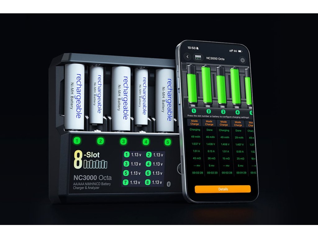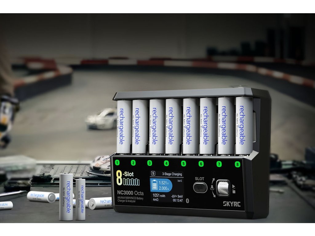 NC3000 Octa umožňuje současně – a přitom nezávisle - nabíjet nebo vybíjet až osm různých tužkových nebo mikrotužkových akumulátorů. Pokud nabíjíte osm stejných akumulátorů, stačí parametry nastavit pro jeden kanál a potom jedním stiskem tlačítka zvolit simultánní nabíjení se stejnými parametry ve všech kanálech. Parametry probíhajícího procesu (nabíjecí/vybíjecí proud, nabitý/vybitý náboj, napětí akumulátoru, vnitřní odpor) jsou průběžně zobrazovány pro všechny kanály na LCD displeji.