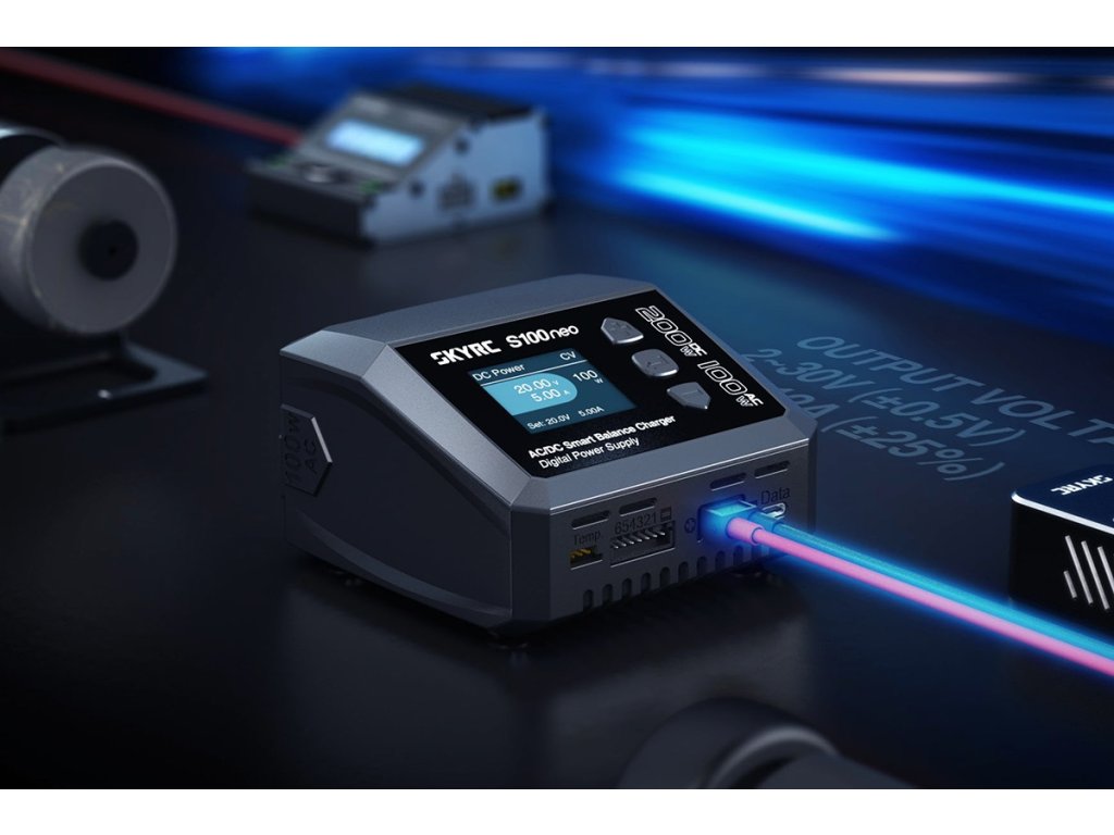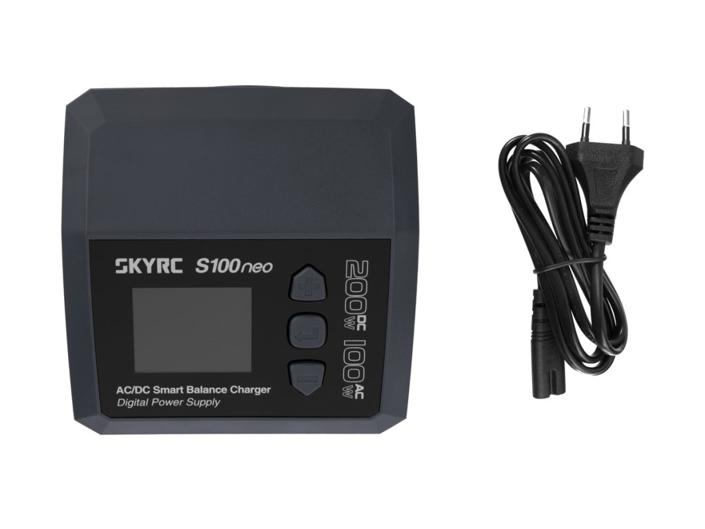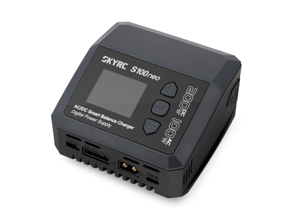 Malý nabíječ SKY RC S100neo 200W byl konstruován se snahou poskytnout vše potřebné pro nabíjení včetně výkonného síťového zdroje, s jednoduchou obsluhou. S100neo umožňuje nabíjet a vybíjet běžné typy článků (NiCd, NiMH, Li-poly, Li-ion, Li-Fe, Li-HV, Pb), navíc je vybaven vestavěným výkonným šestikanálovým balancerem (1 A/článek), který zajišťuje velmi bezpečné a komfortní nabíjení lithiových akumulátorů. Může také pracovat v režimu regulovaného napájecího zdroje s výstupním napětím nastavitelným v rozmezí 2–30 V a proudovým omezením 0,1–12 A.