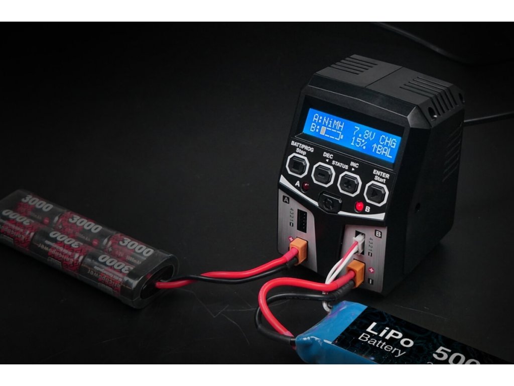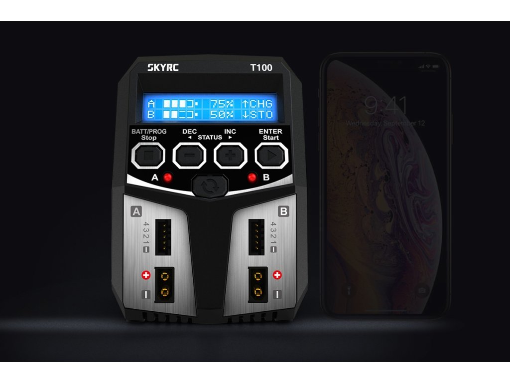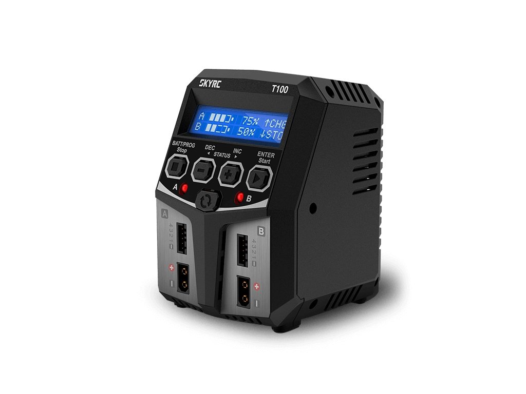 Dvoukanálový nabíječ SKY RC T100 2x50W byl konstruován se snahou poskytnout vše potřebné pro nabíjení dvou akumulátorů současně "pod jednou střechou" včetně síťového zdroje a s velmi jednoduchou obsluhou. Jeho předností je malá kompaktní skříňka v uspořádání „na stojato“ zabírající minimum místa na pracovním stole – asi jako vaše dlaň.