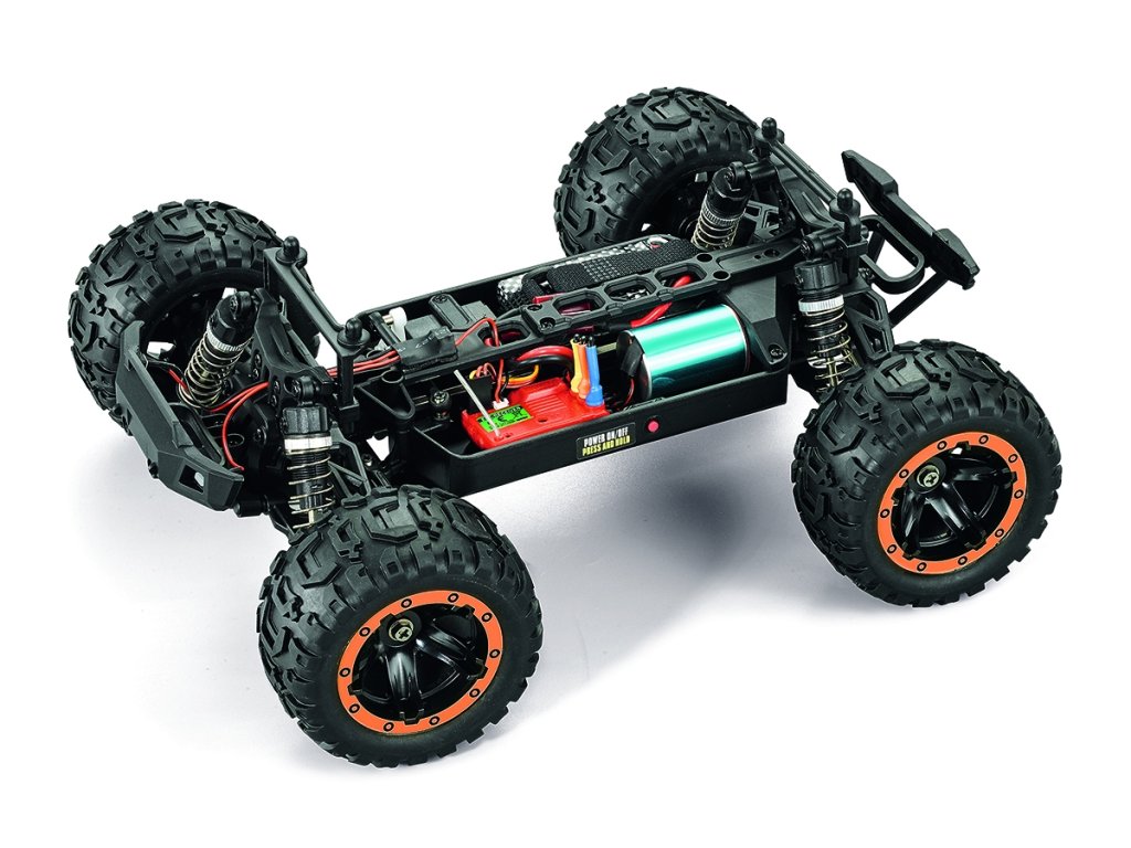 Model Monster trucku v měřítku 1:16 s pohonem všech kol 4x4, poháněný střídavým motorem vč. RC volantové soupravy 2,4 GHz a pohonného akumulátoru. Voděodolný regulátor a přijímač.