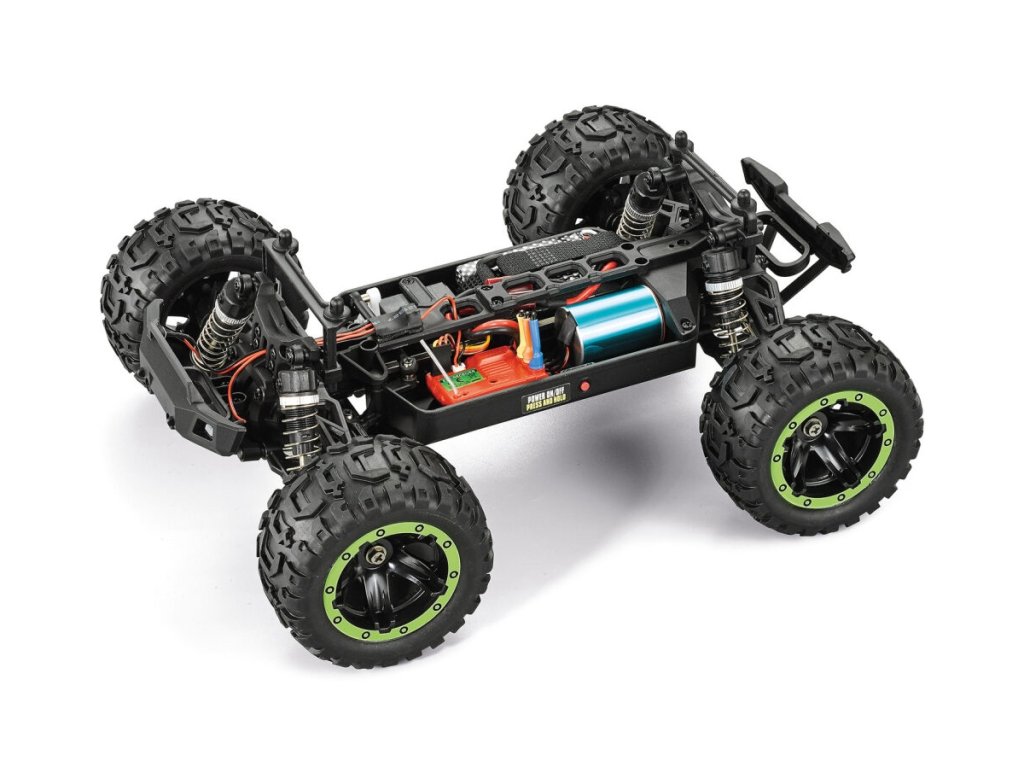 Model Monster truck v měřítku 1:16 s pohonem všech kol 4x4, poháněný střídavým motorem vč. RC volantové soupravy 2,4 GHz a pohonného akumulátoru. Voděodolný regulátor a přijímač.