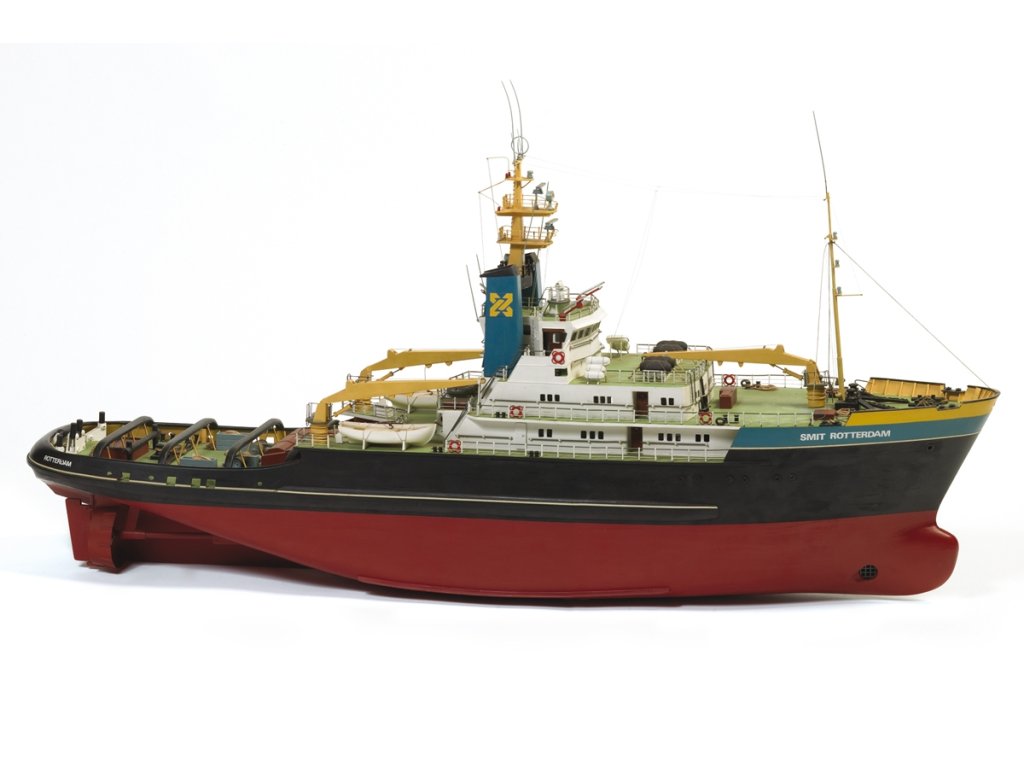 Smit Rotterdam spuštěný na vodu v roce 1975 byl ve své době s výtlakem 2273 tun, délkou 75 m a stroji o výkonu 22 000 HP největší a nejsilnější remorkér na světě. Stavebnice v měřítku 1:75 je určena pro velmi pokročilé lodní stavitele.