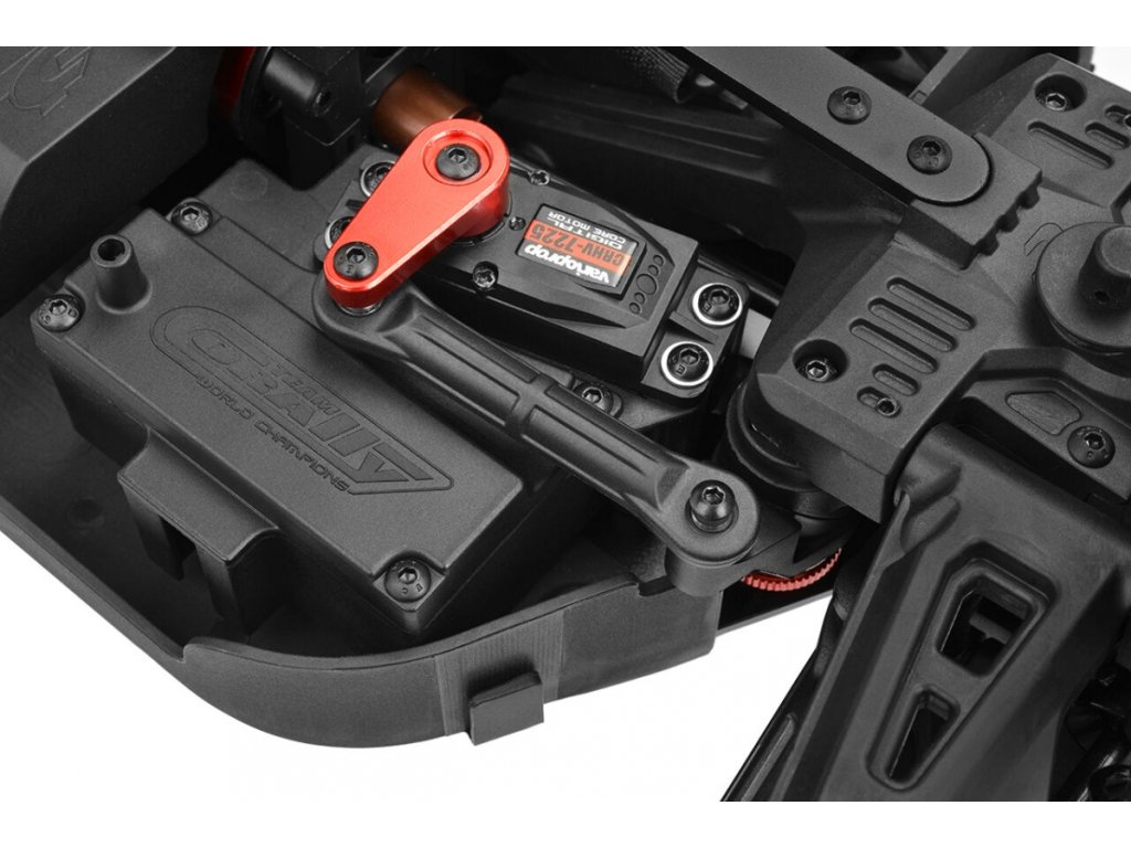 Dodávaný Regulátor Team Corally Torox 185A 4-6S je kromě dalších bezpečnostních a výkonnostních možností vybaven ochranou LiPo akumulátoru, zatímco 4pólový střídavý motor Team Corally Kuron 2050kV poskytuje působivou rychlost a točivý moment. Přesné ovládání řízení zajišťuje HV-7225 HV Servo s kovovými převody. Pohodlná 2,4GHz vysílačka CT2R poskytuje pevné rádiové spojení a nastavitelné funkce pro pohodlí při řízení.