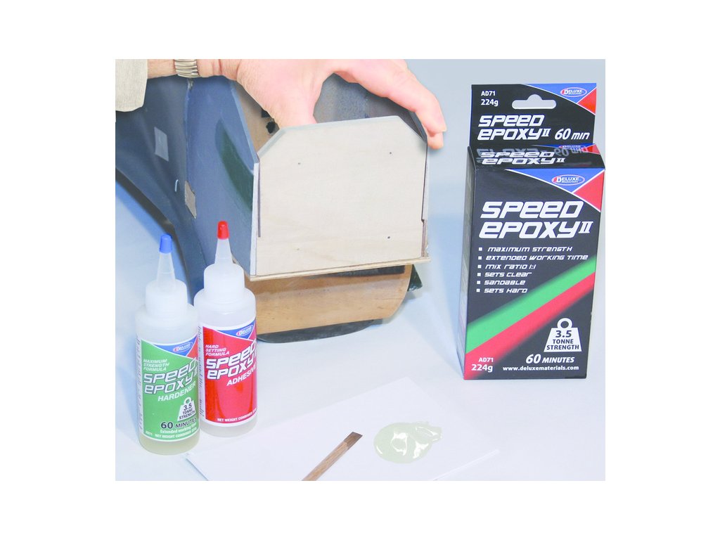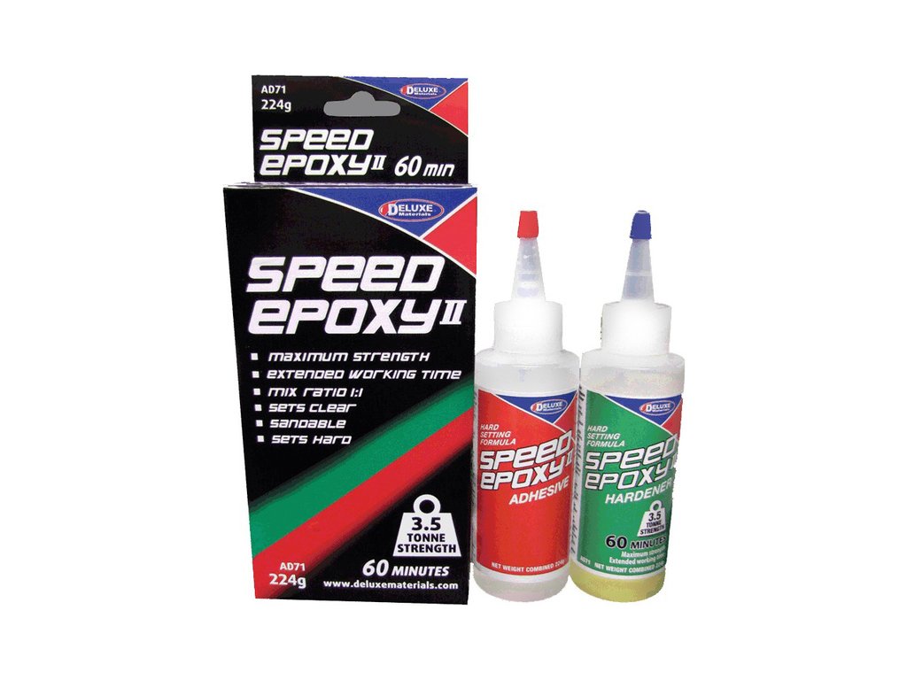 Speed Epoxy II 60 min je nejpevnější epoxid z ucelené řady Speed Epoxy II. Nabízí dostatek pracovního času, lepený spoj má velmi vysokou pevnost a je trvale odolný vůči působení vody a vzdoruje vysokým teplotám. Velmi dobře lepí i kovy. Spoj je snadno brousitelný smirkovým papírem. Pracovní čas je 50 - 60 minut, po smíchání s mikro balony se zkrátí asi na 30 minut). Plné pevnosti je dosaženo po 24 hodinách.