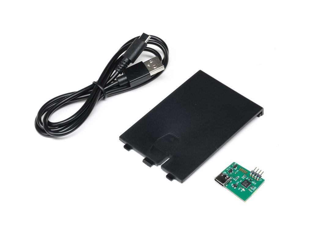 balení obsahuje adaptér vysílače DXS, zadní kryt vysílače s otvorem pro konektor, USB-A / USB-C kabel, manuál EN, DE, FR, IT.