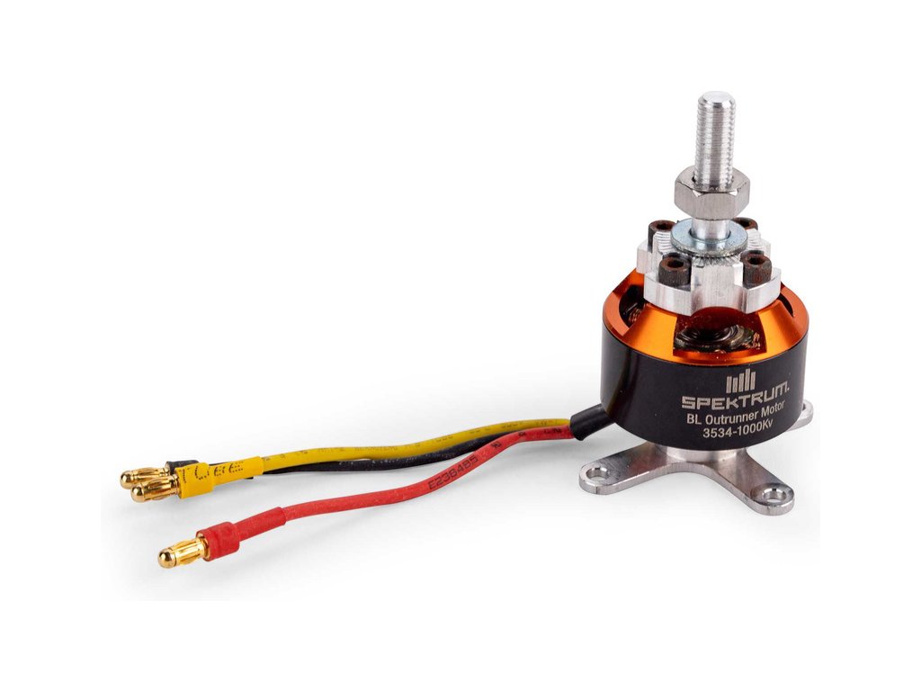 Střídavý motor s oběžným pláštěm Spektrum 3534, 1000ot/V, 14 pólů, pro RC modely letadel. Rozměry: průměr 35mm, délka pláště 17mm, průměr hřídele 6mm, konektory 3.5mm, hmotnost 87g.