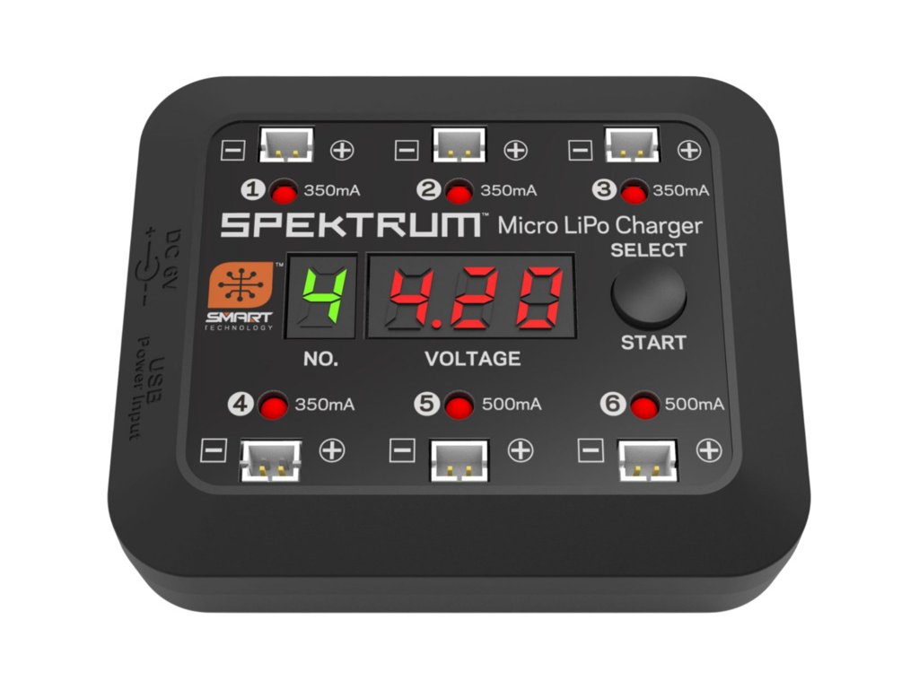 Nabíječ Spektrum Smart S63 je určen pro nabíjení celkem 6ks LiPol baterií 1S s konektorem PH1.25. Má 4 konektory pro baterie 350mAh a 2 konektory pro baterie 500mAh. Tlačítko pro výběr a start, displej pro pozici baterie a displej pro měření napětí na dané pozici baterie. Jednoduše připojíte baterii a stisknete Start.