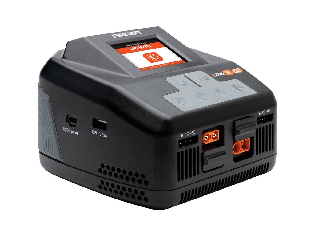 Nabíječ Spektrum Smart G2 S2100 2x100W AC nové generace se dvěma výstupy po 100W a technologií SMART, přináší nejmodernější uživatelsky přívětivé prostředí, ovládání tlačítky, výstup s konektory IC3/IC5, 2x konektor balancéru JST-XH, displej 320 × 240 IPS LCD a USB výstup 5V / 2A pro externí zařízení.