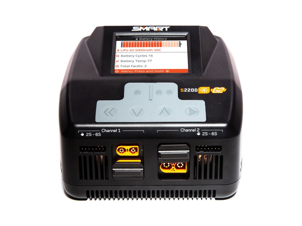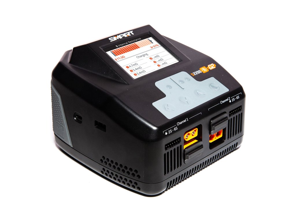Nabíječ Spektrum Smart G2 S2200 2x200W AC nové generace se dvěma výstupy po 200W a technologií SMART, přináší nejmodernější uživatelsky přívětivé prostředí, ovládání tlačítky, výstup s konektory IC3/IC5, 2x konektor balancéru JST-XH, displej 320 × 240 IPS LCD a USB výstup 5V / 2A pro externí zařízení.
