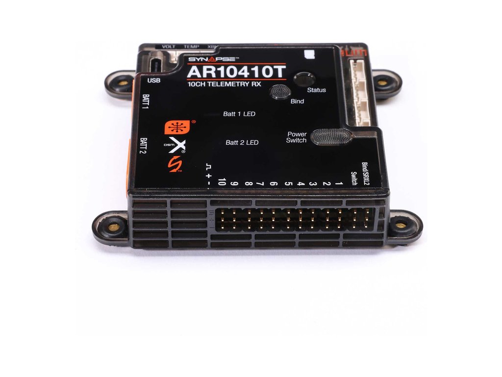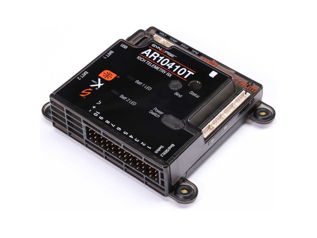 RC přijímač Spektrum AR10410T PowerSafe s 10 kanály a s telemetrií. Konektory pro telemetrické čidla otáček, napětí a teploty, konektor X-Bus. Redundantní napájení dvojicí baterií s konektory IC3. Vhodný pro obří modely letadel, větroňů a vrtulníky. Možnost zapojení modulu AS3X+/SAFE. Barometrický senzor.