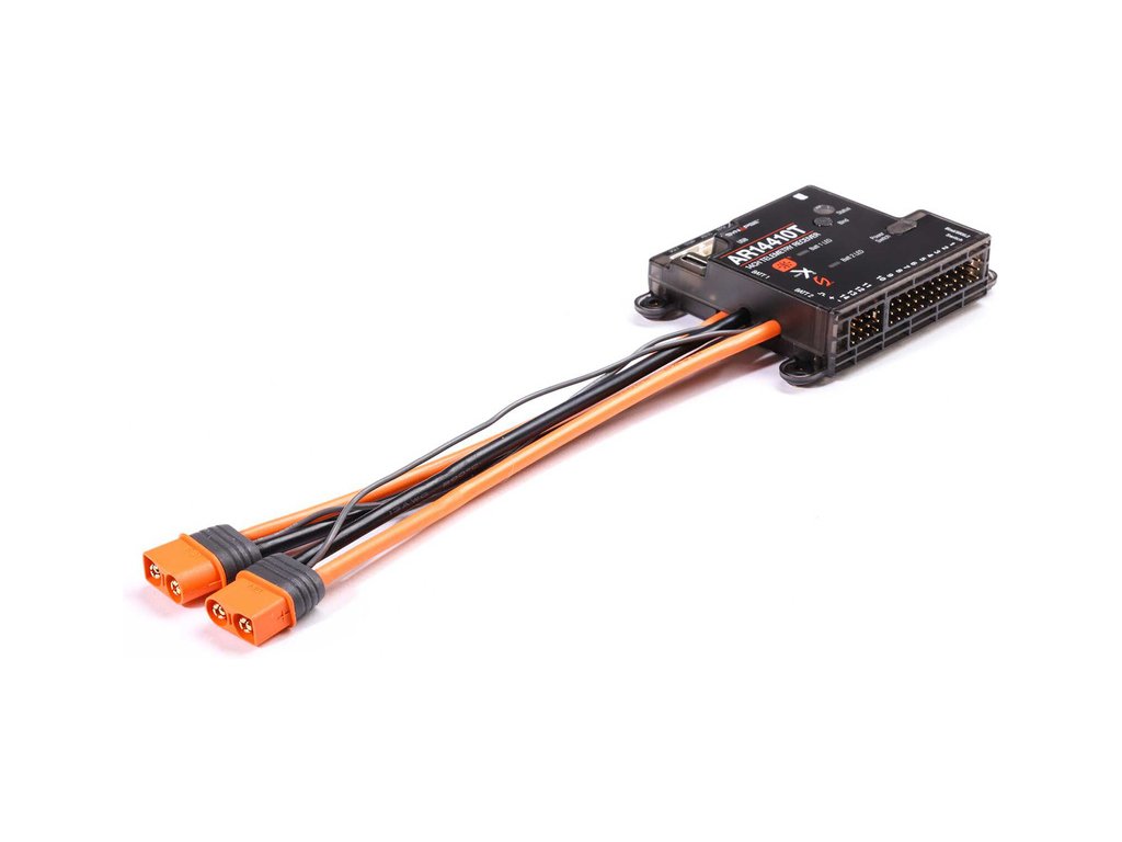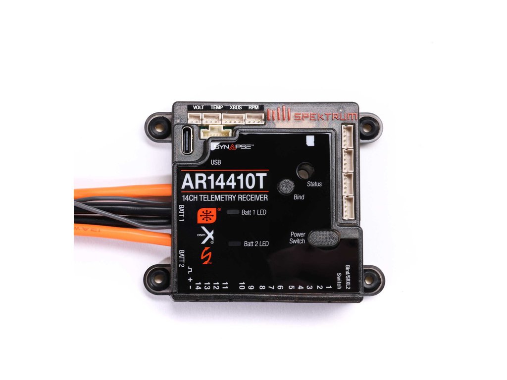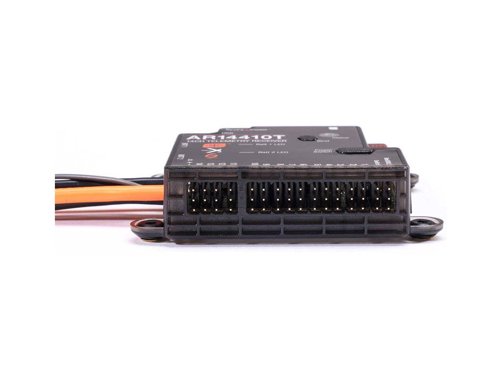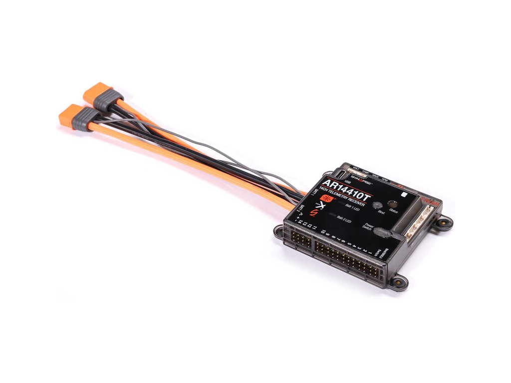 Převratnou funkcí přijímače AR14410T PowerSafe jsou vestavěné senzory, které zaznamenávají spotřebovanou kapacitou akumulátorů Smart. Přijímač má porty pro otáčky, napětí letových baterií a senzory teploty a také port X-Bus pro další externí telemetrie. Snadnou aktualizaci zaručuje USB-C port.