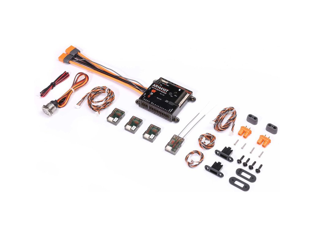 V balení je přijímač Spektrum AR14410T, 1x Spektrum Serial SRXL2 s telemetrií, 3x Spektrum DSMX SRXL2, kabely přijímačů s délkou: 22, 30, 60 a 90 cm, 2ks konektor IC3, senzor napětí, vypínač, 2ks nabíjecí zásuvka. Návod v češtině a manuál EN, DE, FR, IT.