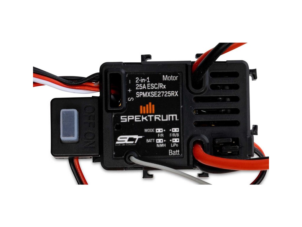Spektrum stejnosměrný regulátor 25 A s přijímače SLT pro RC menší RC modely aut v měřítku 1:18. Konektor pro zapojení akumulátoru IC2.