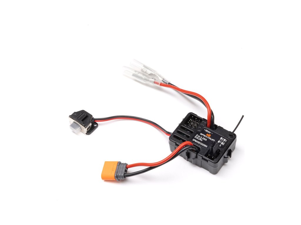 Spektrum 2v1 combo stejnosměrný regulátor 25A s integrovaným přijímačem SLT. Pro RC modely aut 1:12 - 1:18. Konektory IC2 (napájení- přístroj), dutinky 3.5mm (motor). Spínaný BEC 6V/3A. Funkce plyn, brzda, zpátečka. Rozměry 36x26x14mm, hmotnost 22.5g. Doporučený motor velikosti 380/390. Náhradní pro model Losi NASCAR.