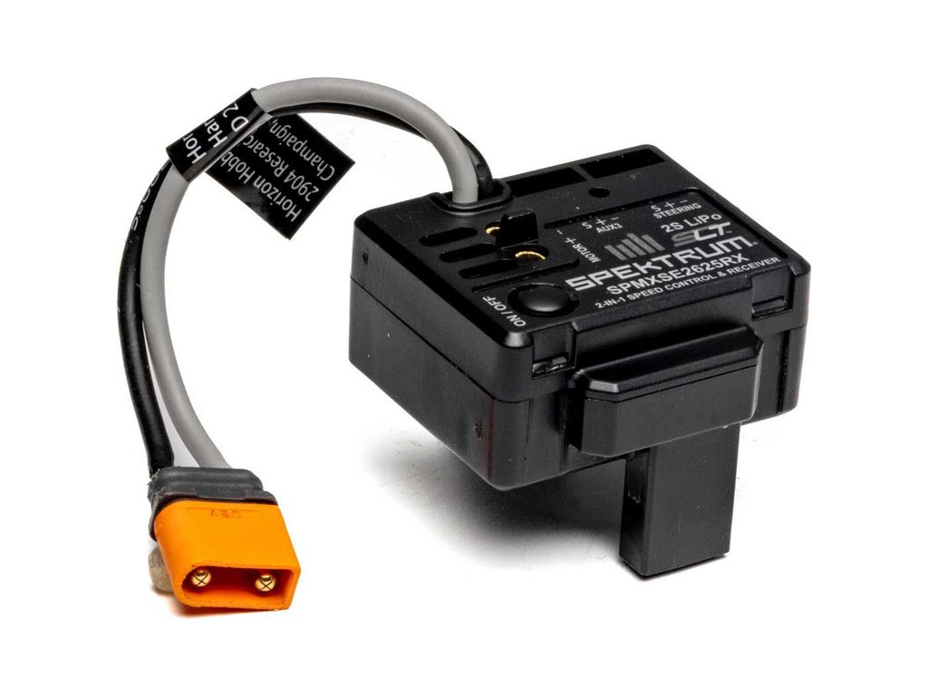 Náhradní díl pro RC modely aut Arrma Grom 1:18-1:14 4WD: Voděodolné combo 2-v-1 - regulátor stejnosměrný 25A + Spektrum přijímač SLT. Napájení 2S LiPol, určeno pro vysílač Spektrum SLT2 2,4GHz.