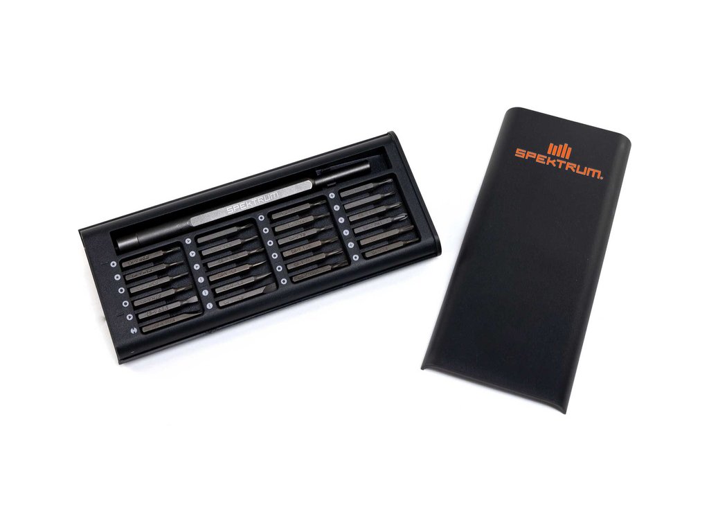 Sada přesného nářadí Spektrum Mini Precision 24-v-1. Kompaktní sada menších bitů s hliníkovou rukojetí a magnetickým držákem. Obsahuje celkem 24 bitů vyrobené z oceli S2: křížový Phillips, plochý, Hex (imbus), Torx, Y-typ a další v různých velikostech.
