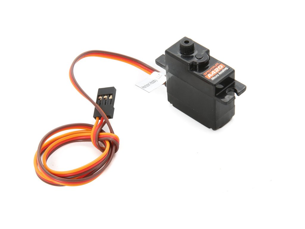 Náhradní díl pro RC model letadla E-flite Pulse 15e: Spektrum servo S420 17g analogové (400mm). Rozměr 13x28mm.