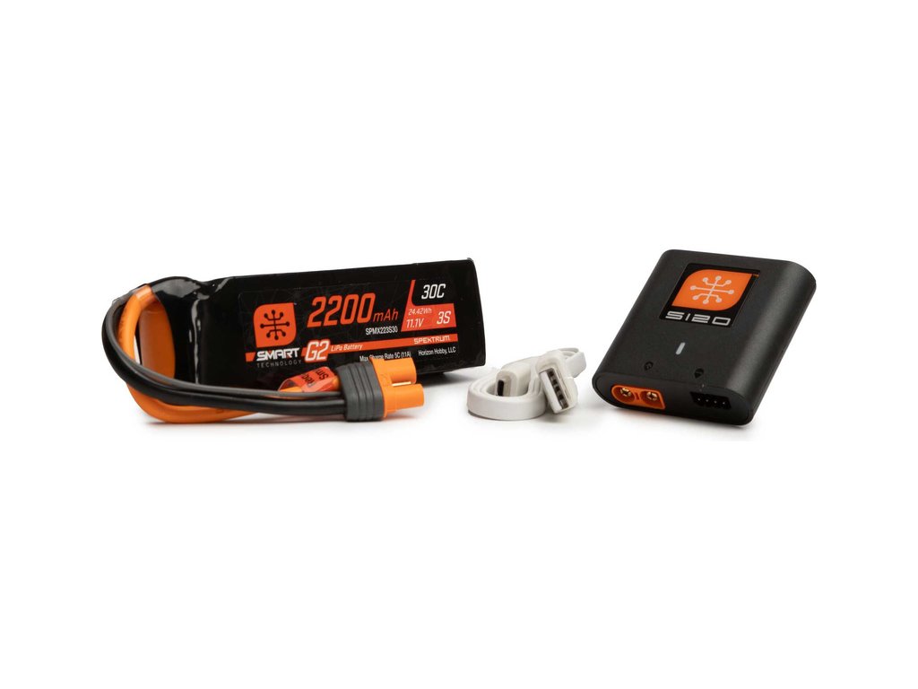 Spektrum Smart PowerStage G2 Air 2 je sada LiPo akumulátoru 11.1V 2200 mAh 30C IC3 a nabíječe Spektrum Smart S120 20W USB-C. Balíček technologií Smart G2 s bezpečným a velmi snadným nabíjením pro RC modely letadel.